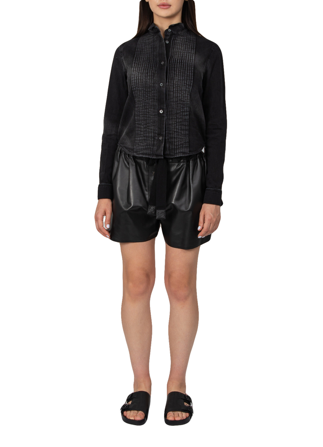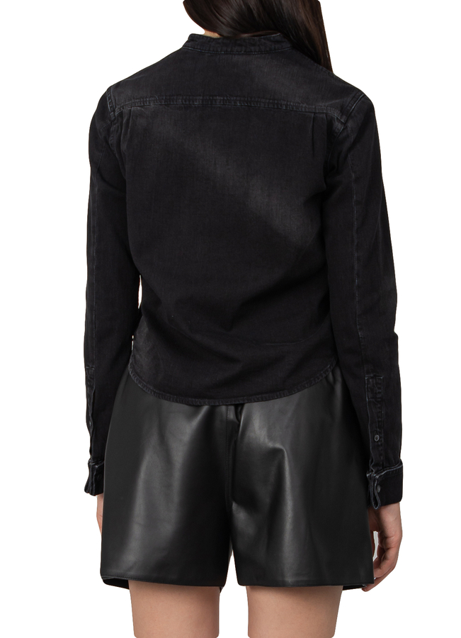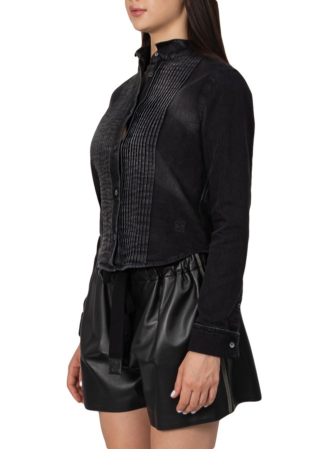 - Джинсовая рубашка с длинными рукавами, застежка на пуговицы спереди, детализация плиссе, манжеты на пуговицах, сбоку вышивка анаграммы