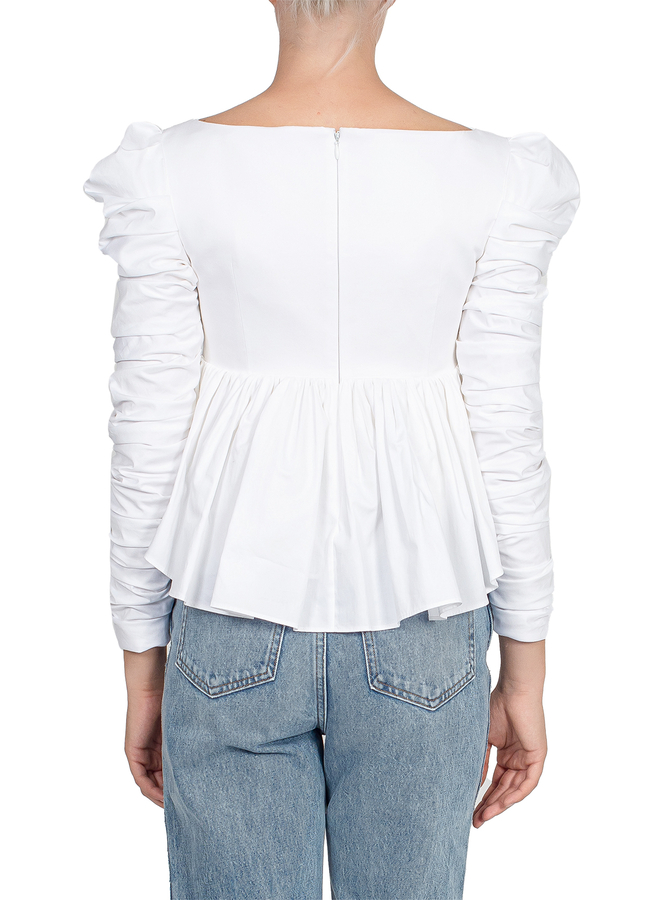 - Шовкова блуза Peplum з довгими рукавами. Застібка на блискавку ззаду, довгі драпіровані рукава, драпірована талія, виріз горла у формі серця.