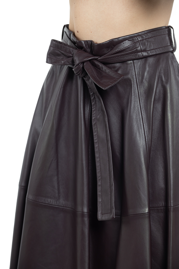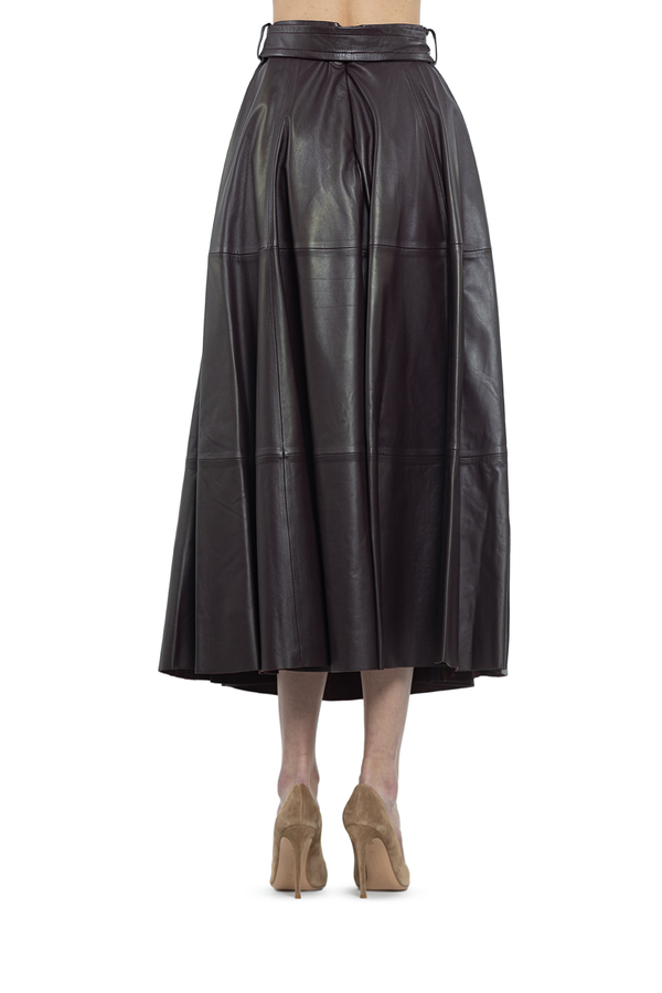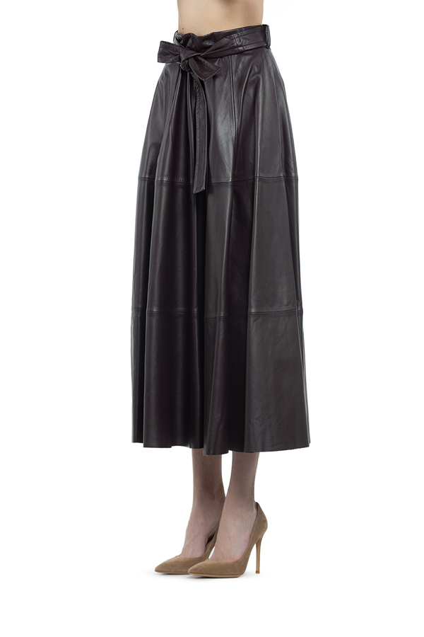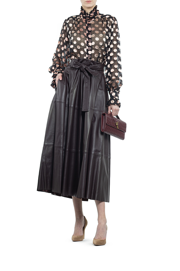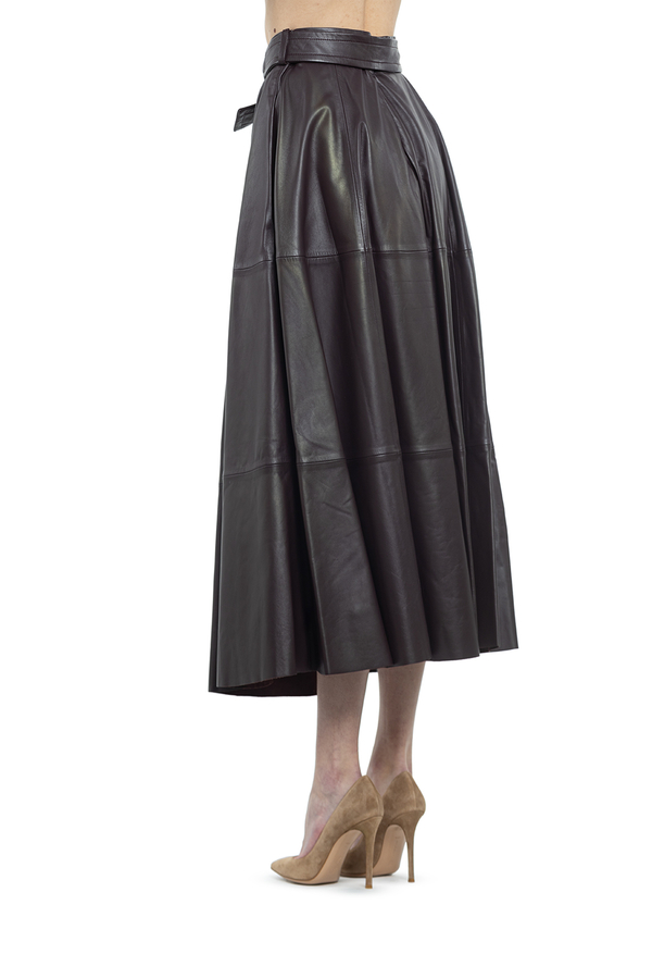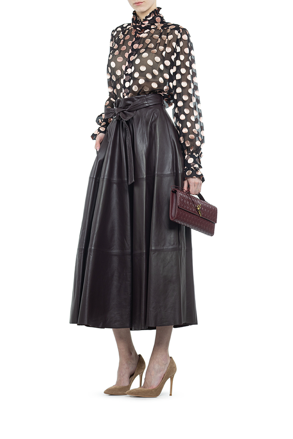 - Шкіряна довга спідниця з широким шкіряним паском. Середня посадка, розкльошений крій, довжина до середини гомілки, пояс, шльовки.
