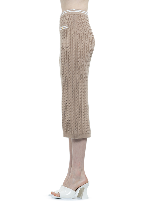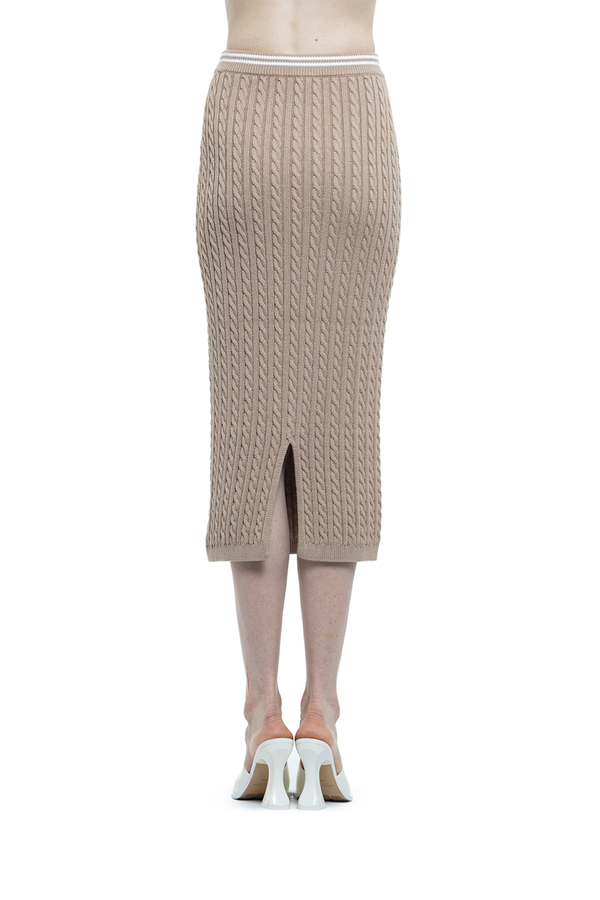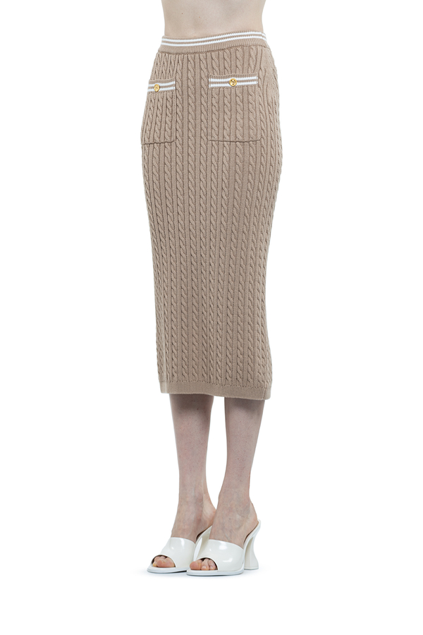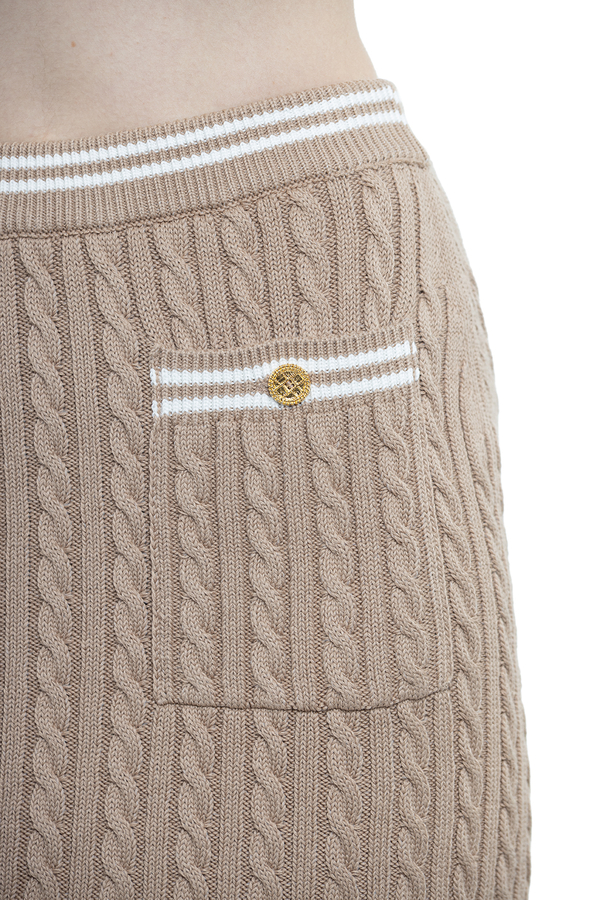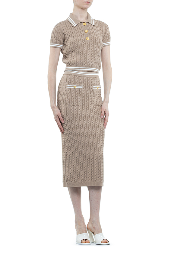 - Спідниця міді, виконана в техніці «косична в'язка», дві накладні кишені на ґудзиках спереду, еластичний пояс, виріз ззаду