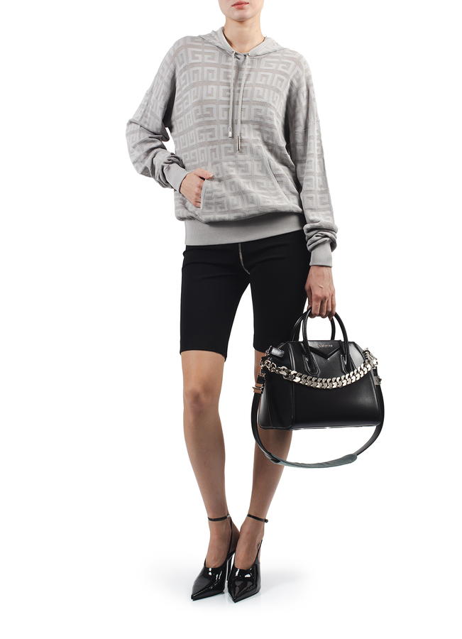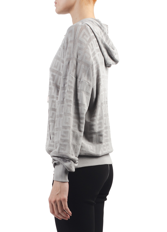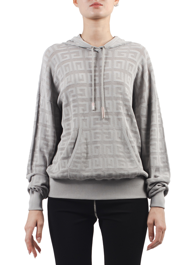 - Трикотажне худі з патерном логотипу і капюшоном. Короткої довжини, з кишенею-кенгуру спереду і куліскою в капюшоні.