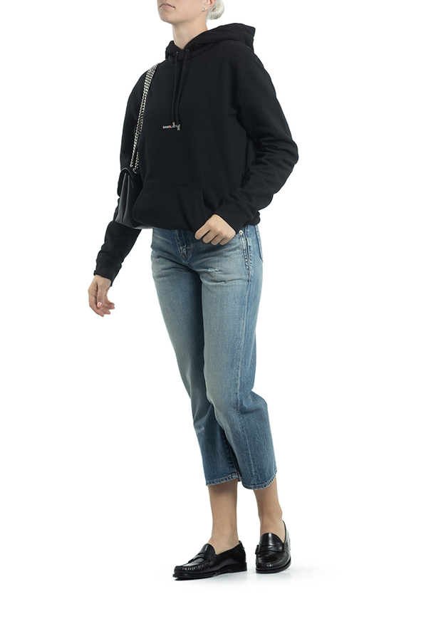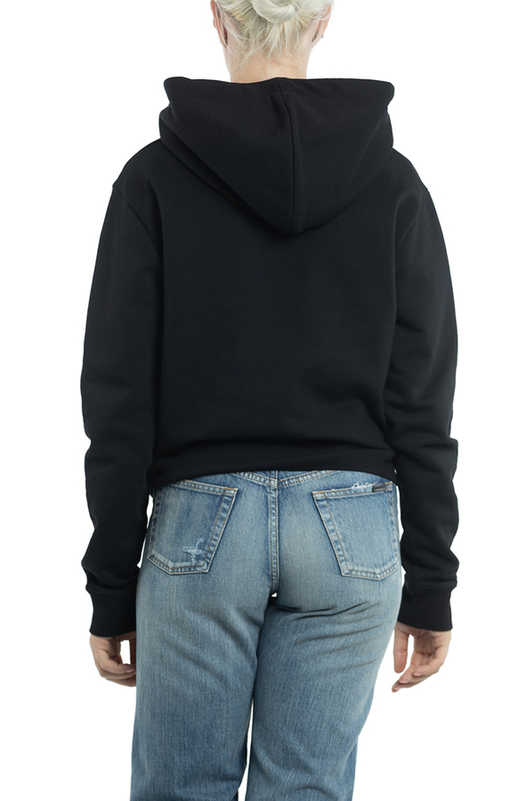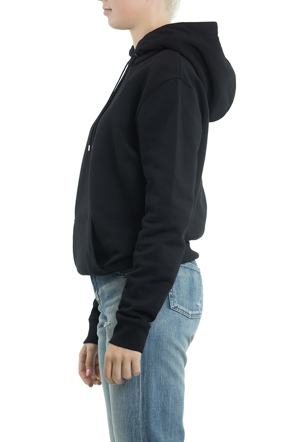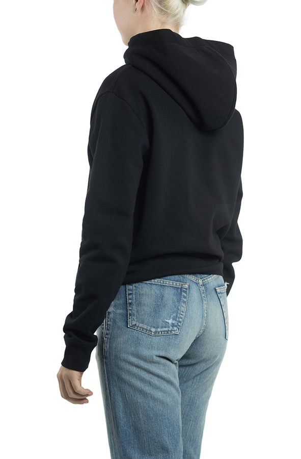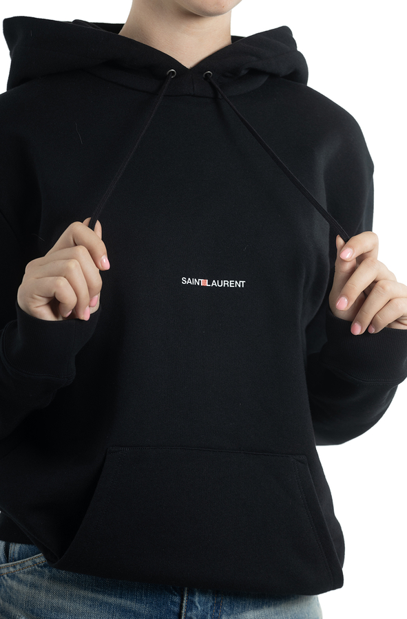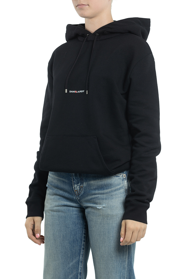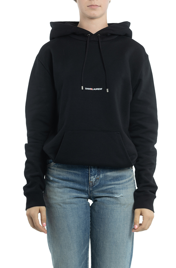 - Худі з капюшоном і логотипом спереду. Куліска на капюшоні, кишеня-муфта, довгі рукави та прямий поділ.
