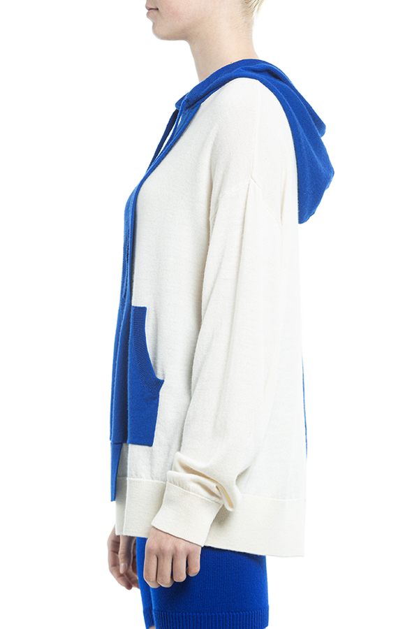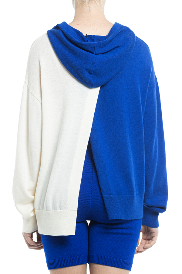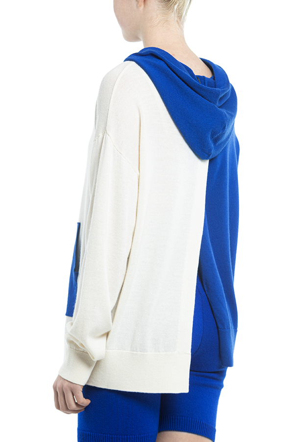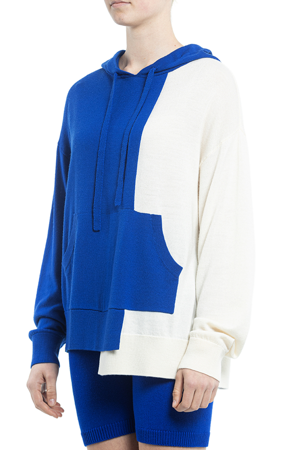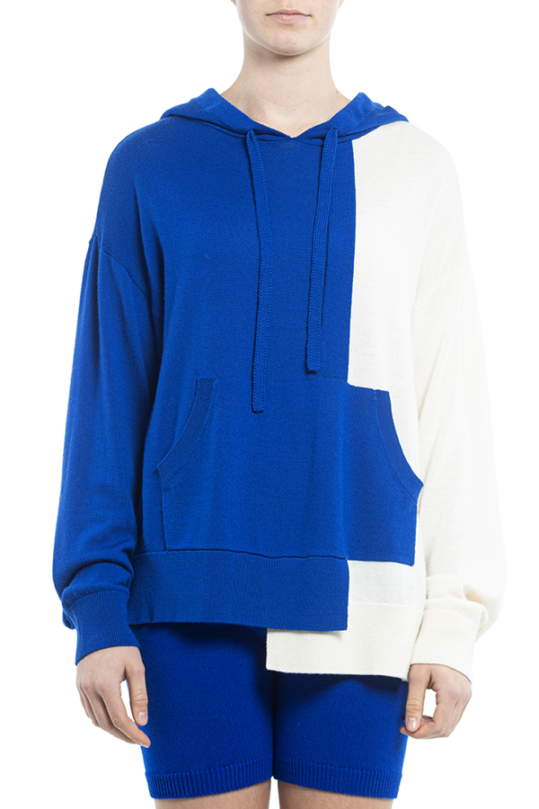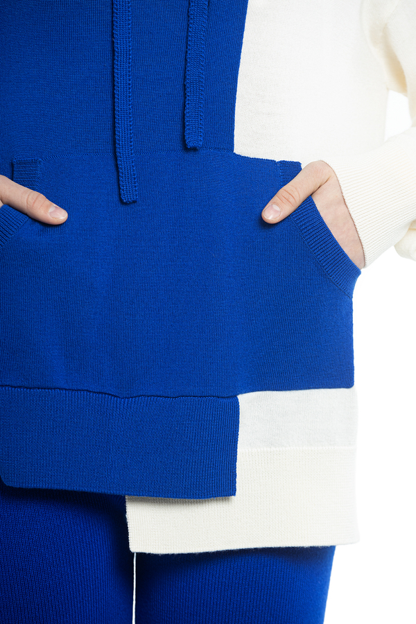 - Трикотажне худі асиметричного крою, стиль колор-блок, довгий рукав, приспущені плечі, кишеня-кенгуру
