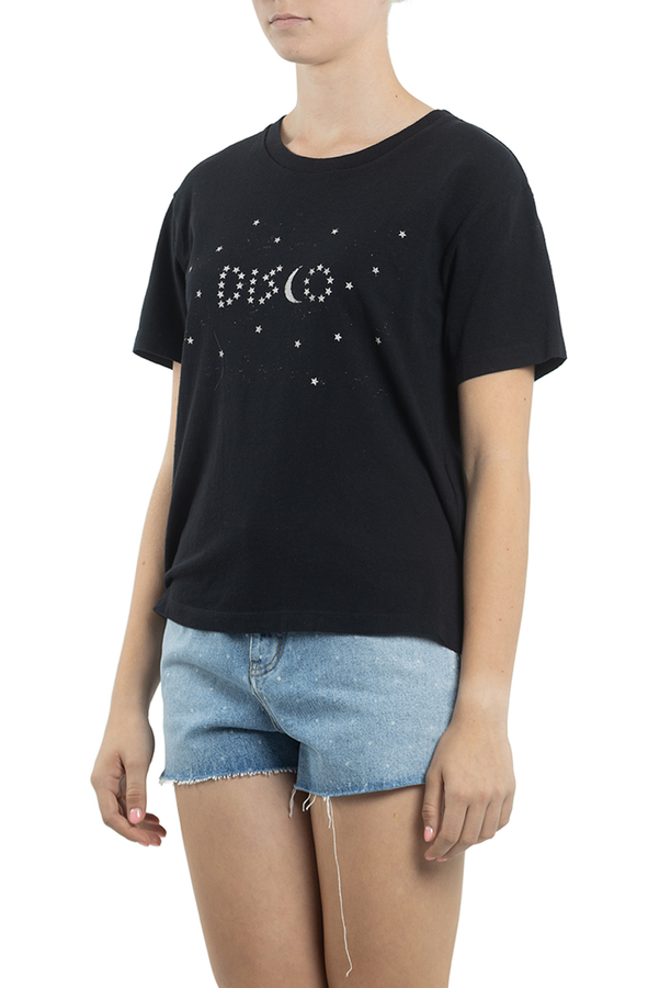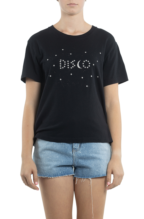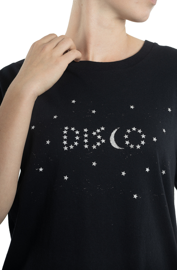 - Бавовняна футболка з короткими рукавами. З написом зірками спереду. Вільний крій, круглий виріз горловини, напис DISCO з дрібних зірок.