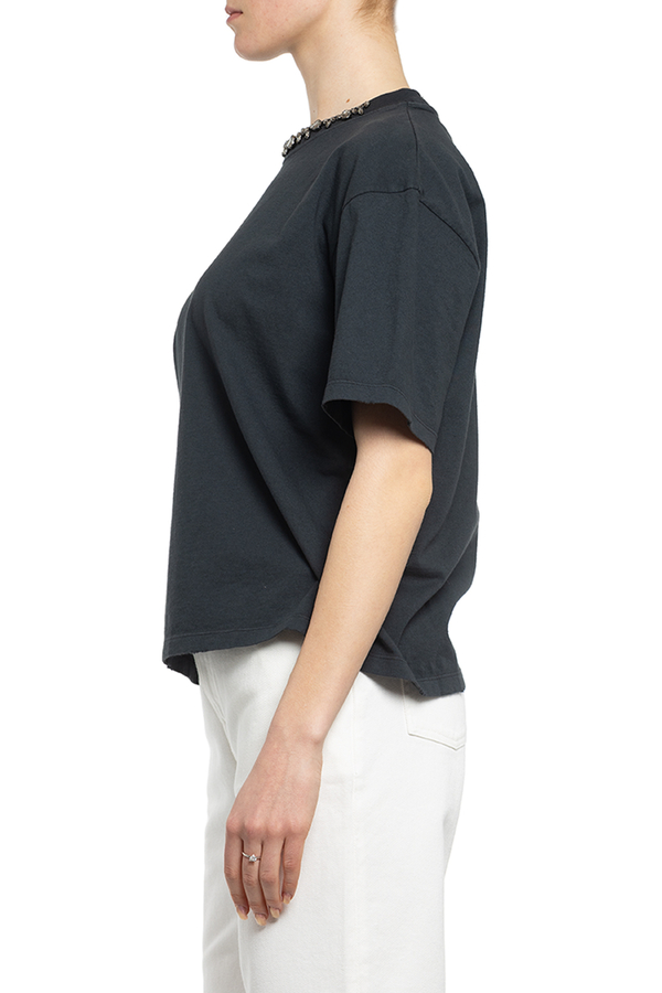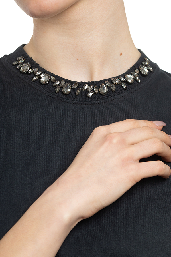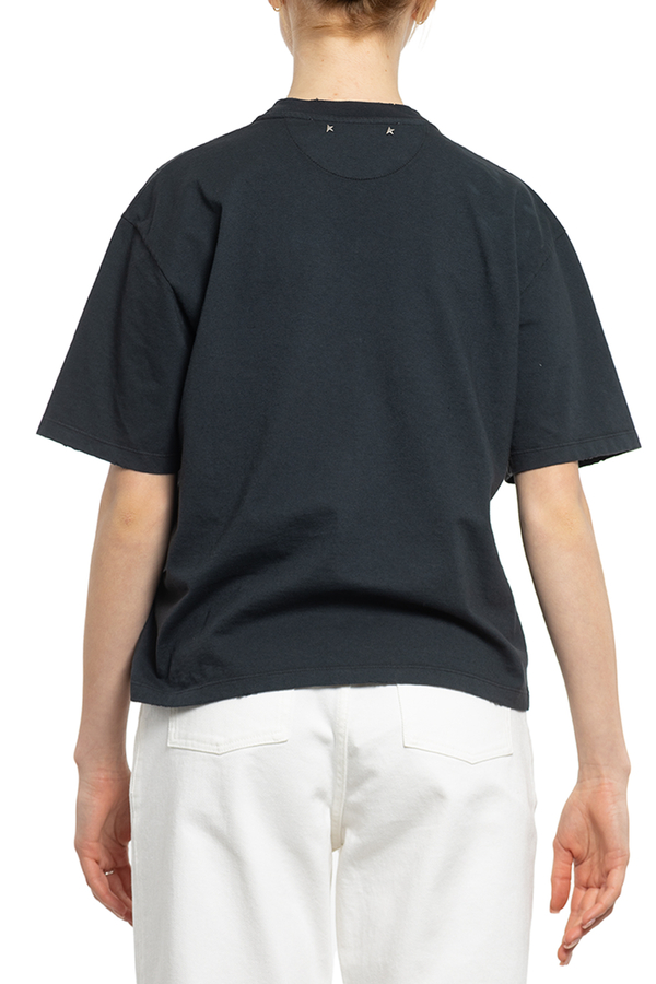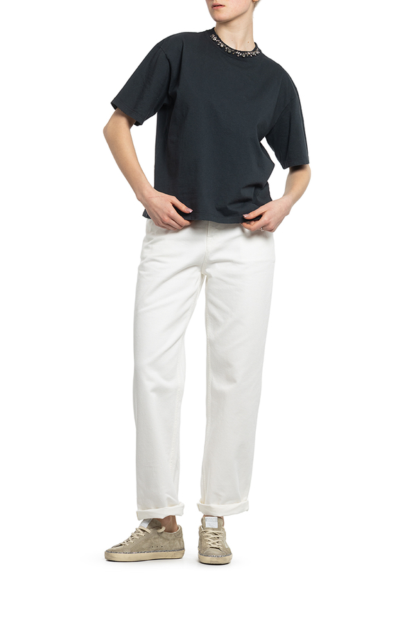 - Футболка з короткими рукавами, круглий виріз горловини, оздоблений кристалами, фірмова подвійна золота зірка на спині