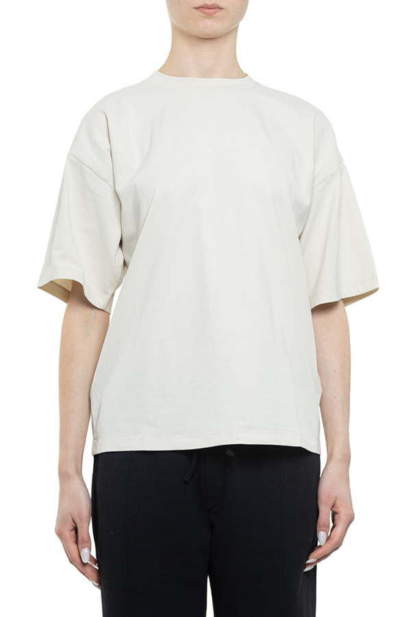 - Футболка с короткими рукавами, заниженная линия плеч, этикетка с логотипом сзади