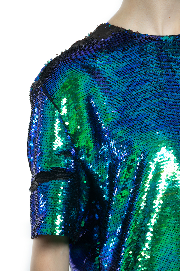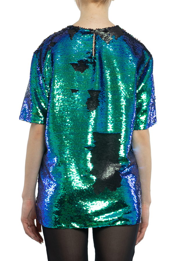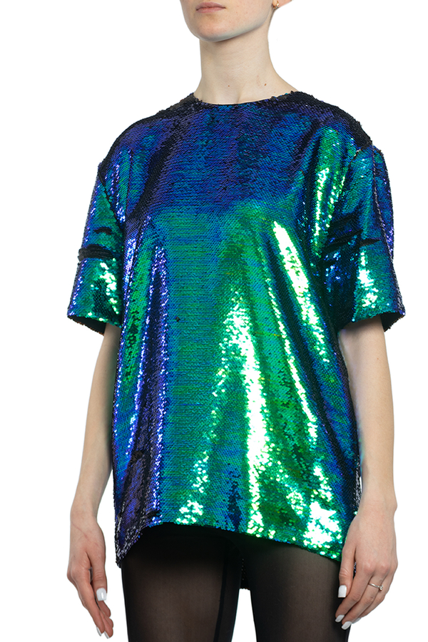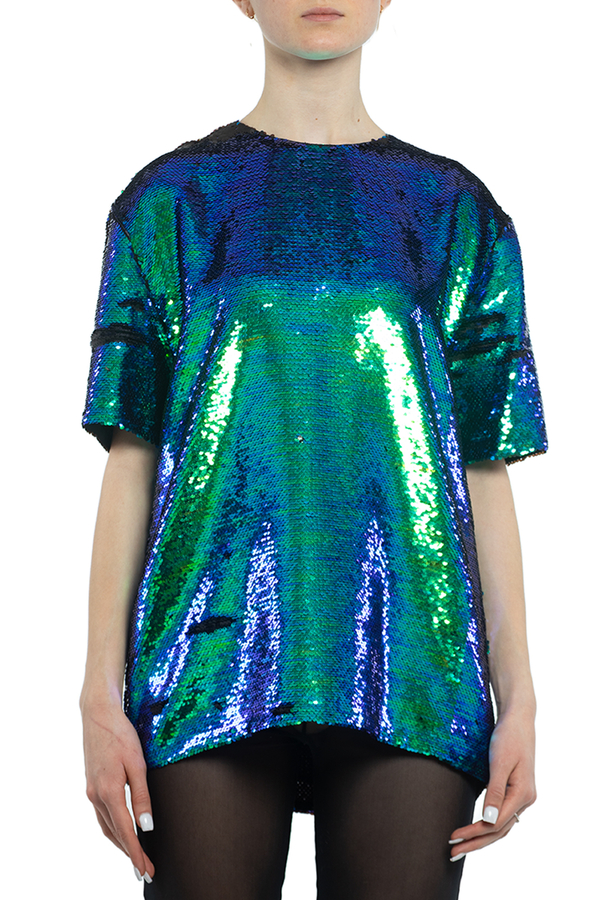 - Футболка прикрашена паєтками. Короткі рукави, круглий виріз.