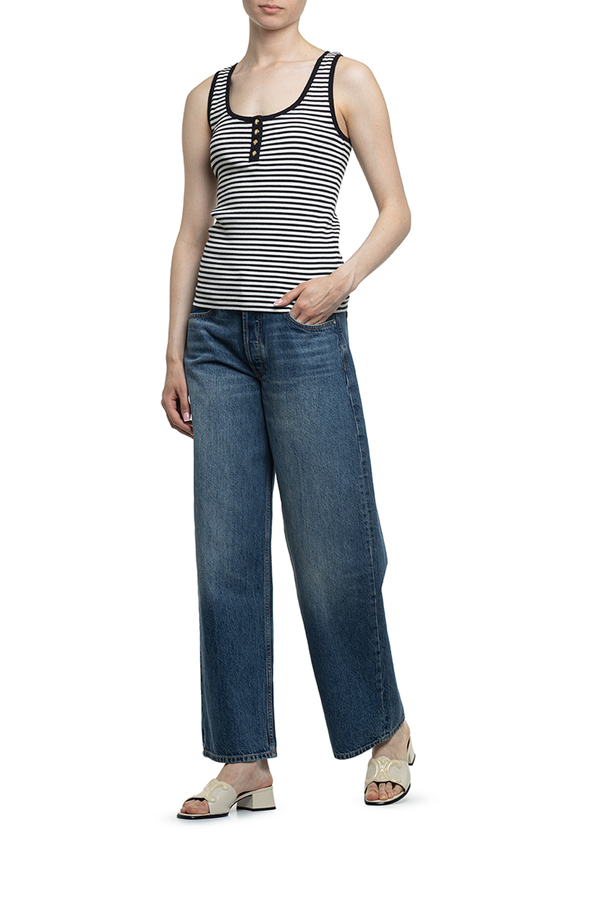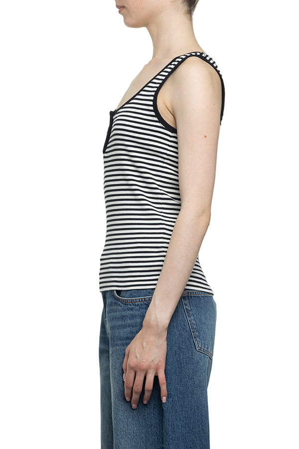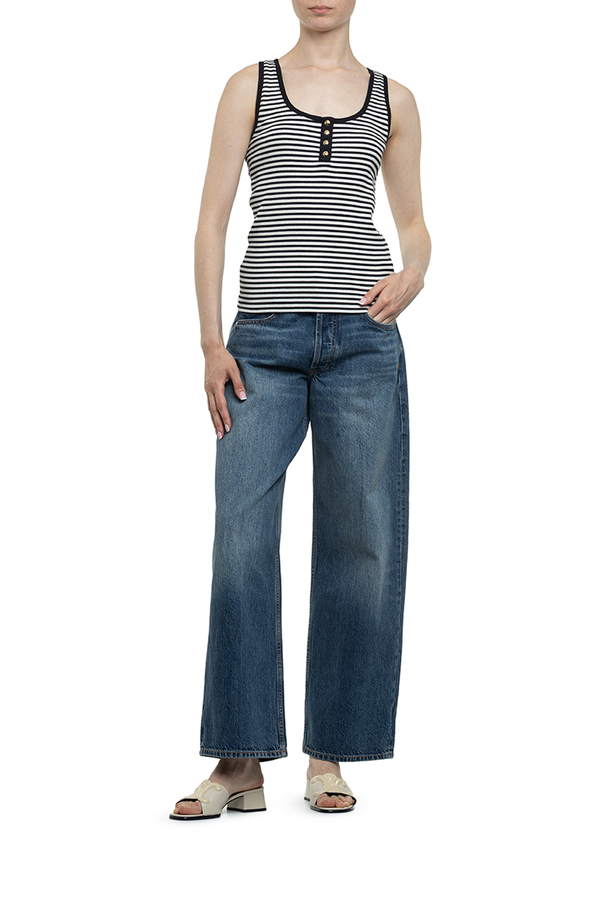 - Майка в рубчик, контрастна стрічка, вставка із золотистими гудзиками з монограмою