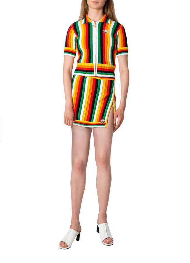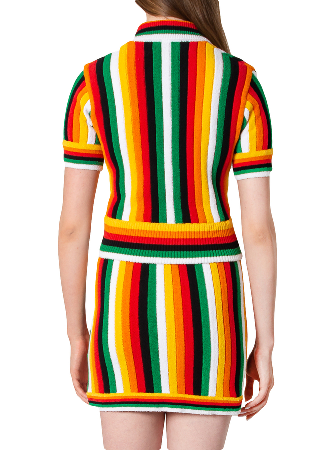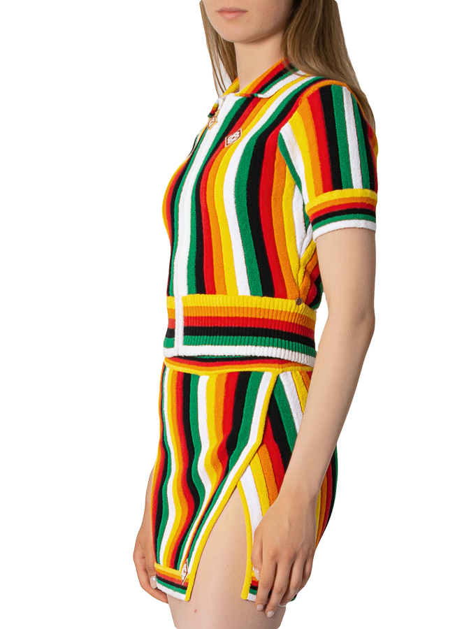 - Разноцветный полосатый топ, короткие рукава с манжетами, нашивка с логотипом на груди, спереди молния