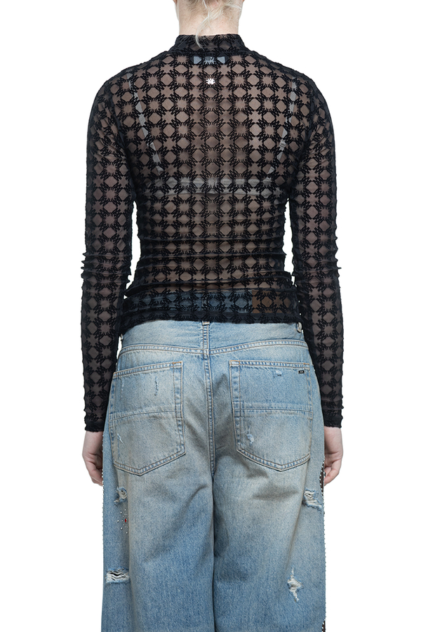 - Прозрачный топ с длинными рукавами, приталенный крой, высокий воротник-стойка, геометрический узор.