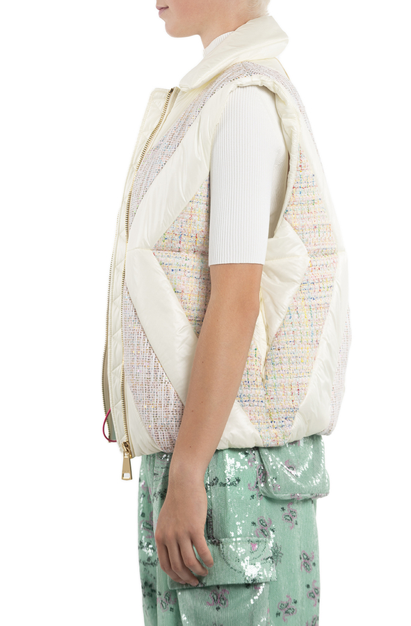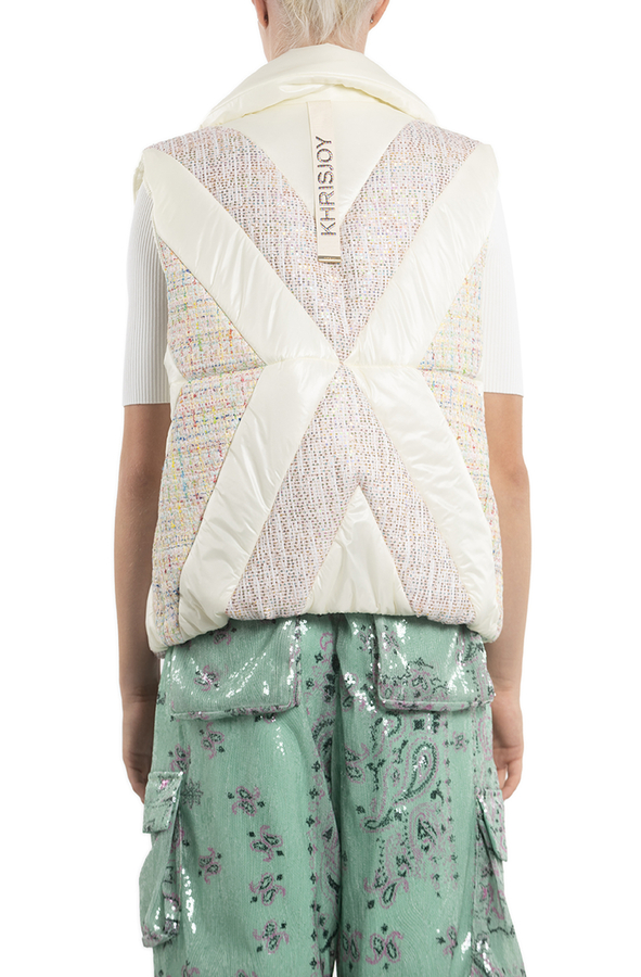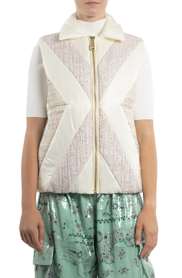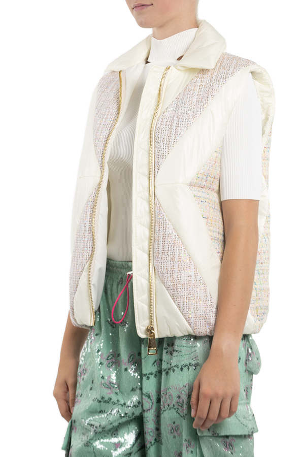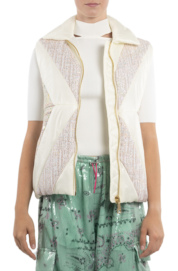 - Жилет, оздоблений паєтками, контрастні вставки, еластичний поділ, дві кишені у швах, застібка-блискавка спереду, ремінець з вишитим логотипом позаду