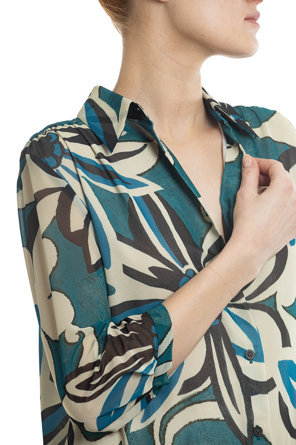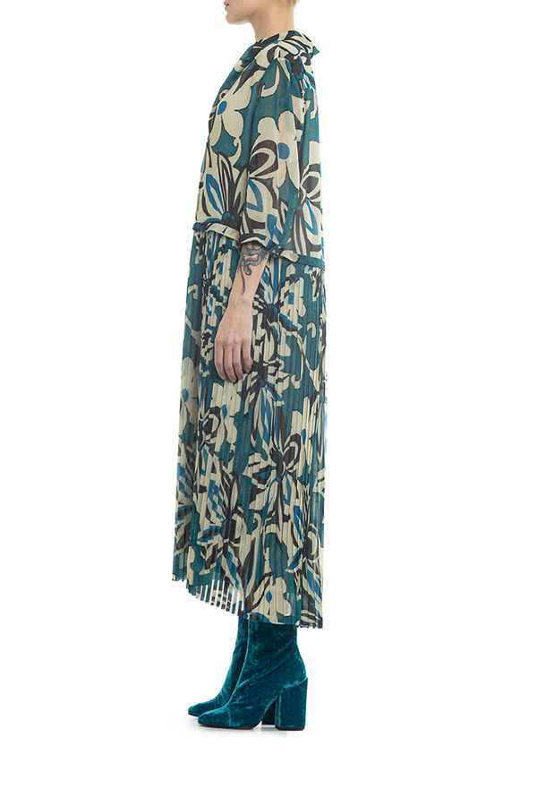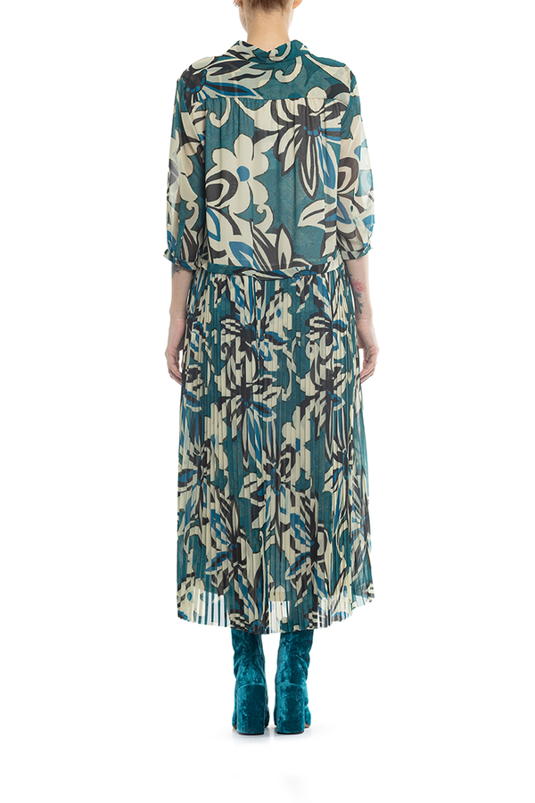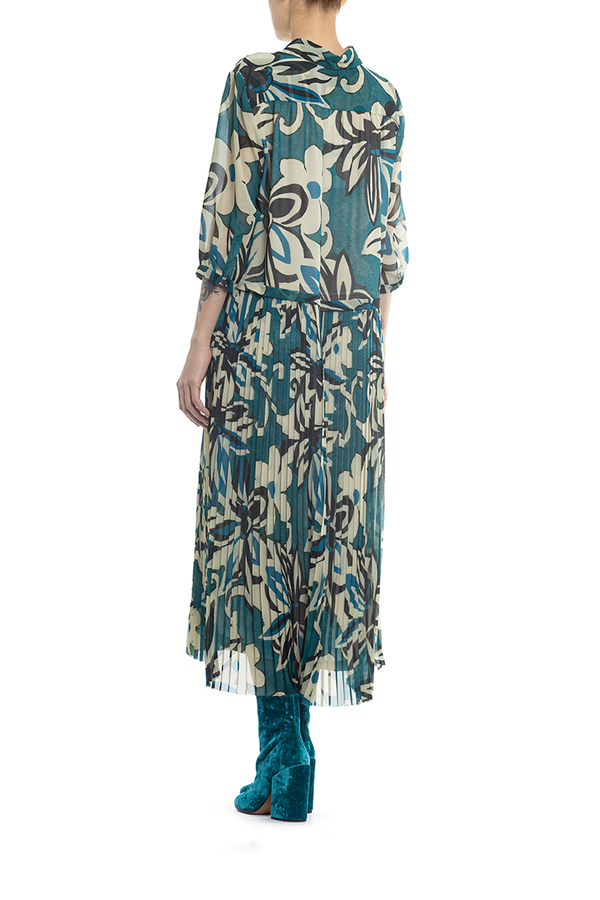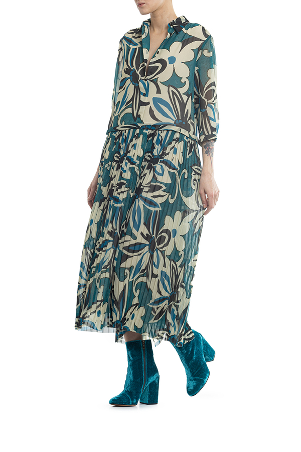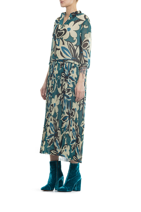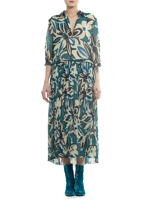 - Сукня середньої довжини, укорочений рукав, спідниця пліссе, принт у квіточку.