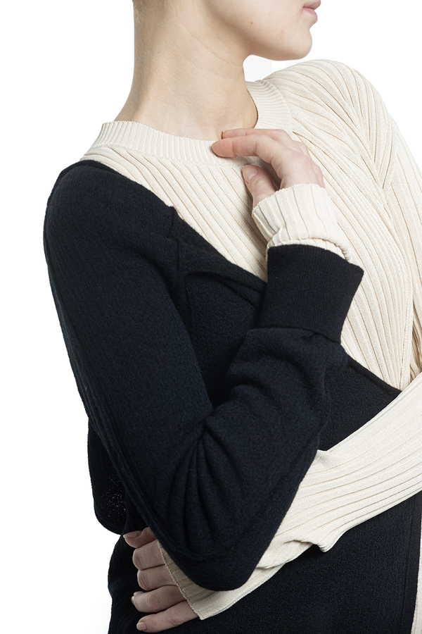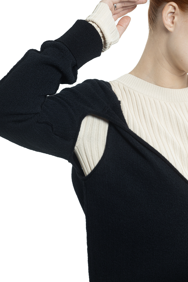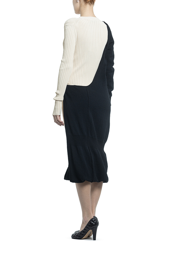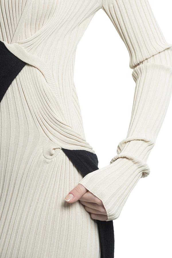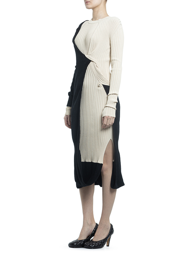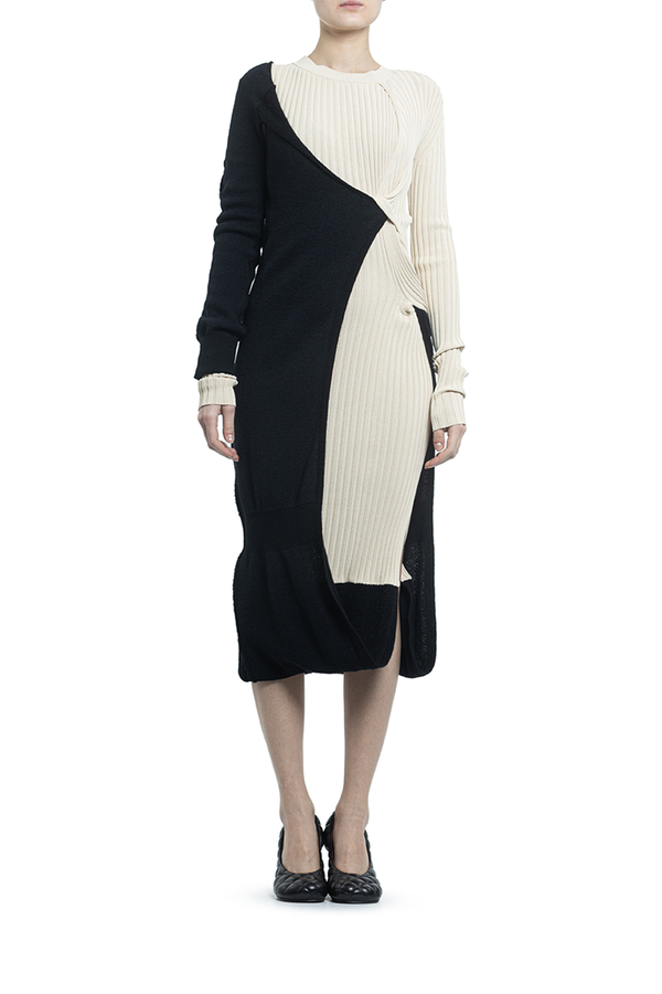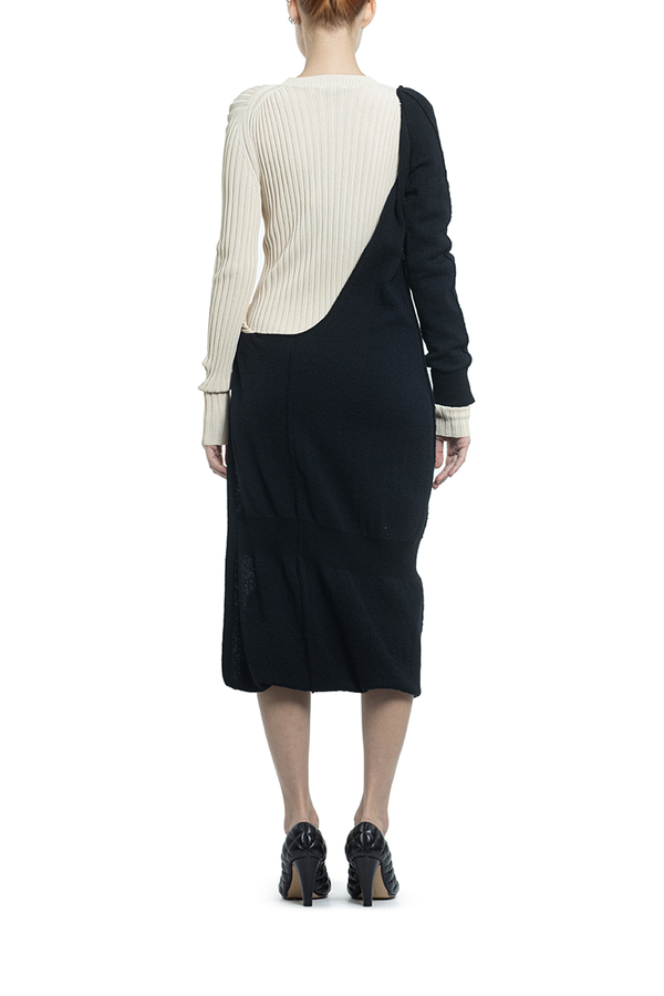 - Сукня з довгими рукавами. Середньої довжини з віскозного трикотажу. Двуколірний дизайн. Трикотажний комір з круглим вирізом.