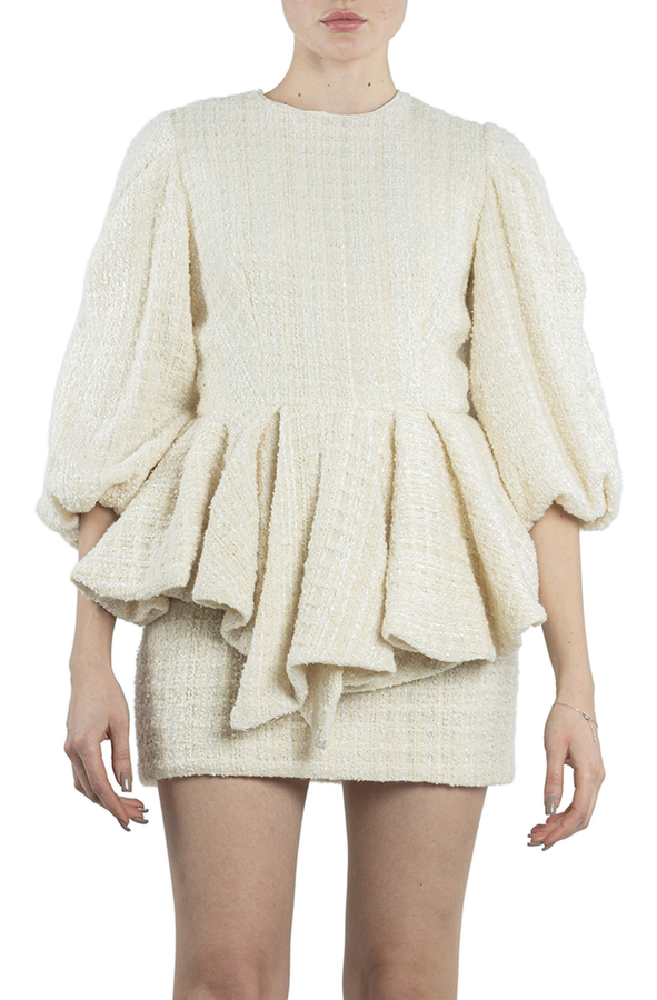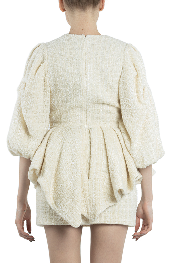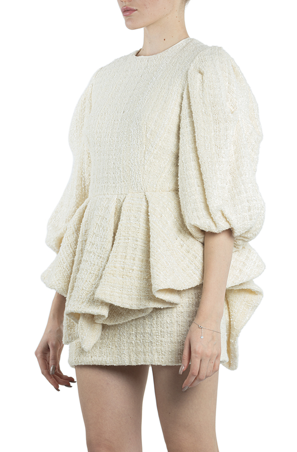 - Коротка сукня з довгими рукавами. З оборками навколо талії.