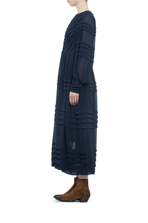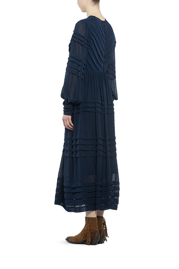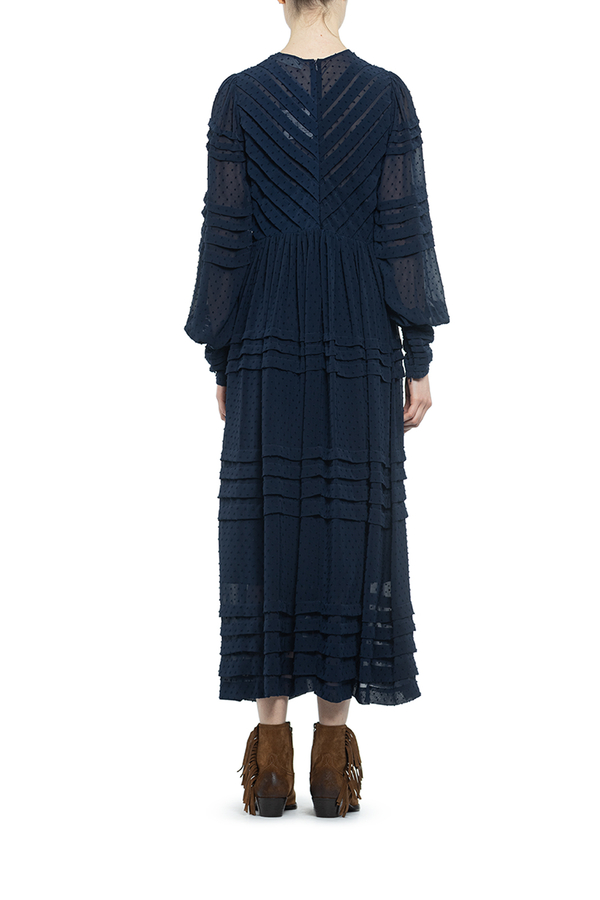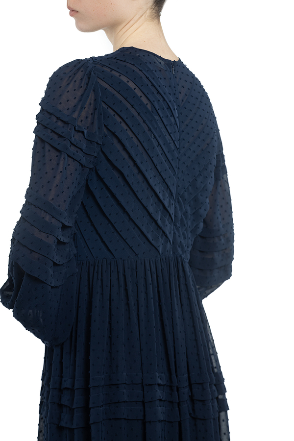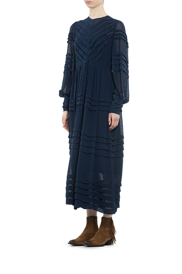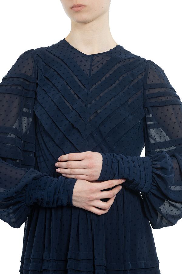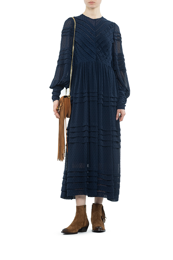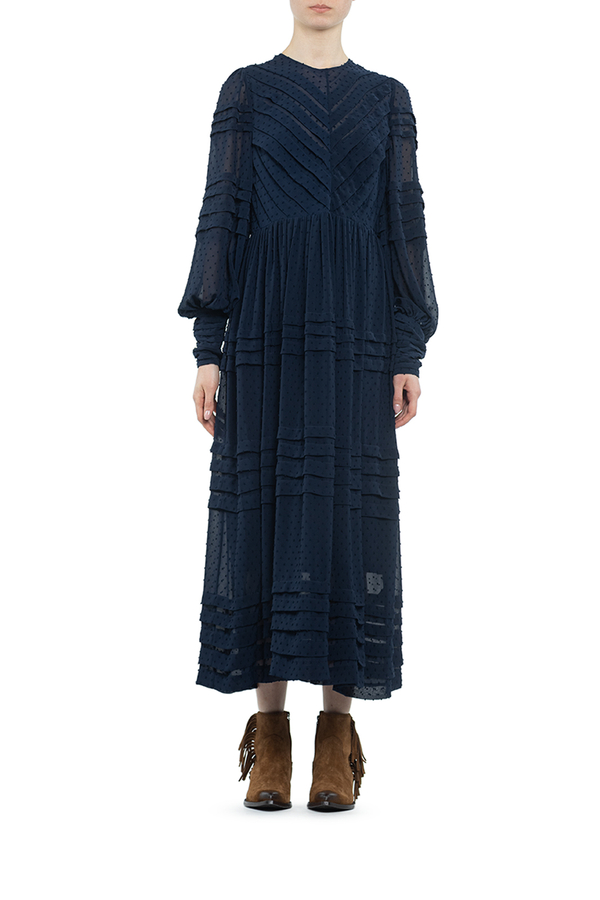 - Довга сукня в дрібний горох, з довгими рукавами. Приталений крій, довжина максі до щиколотки, об'ємні рукави з легким напуском на манжети, круглий виріз горловини, застібка-блискавка.