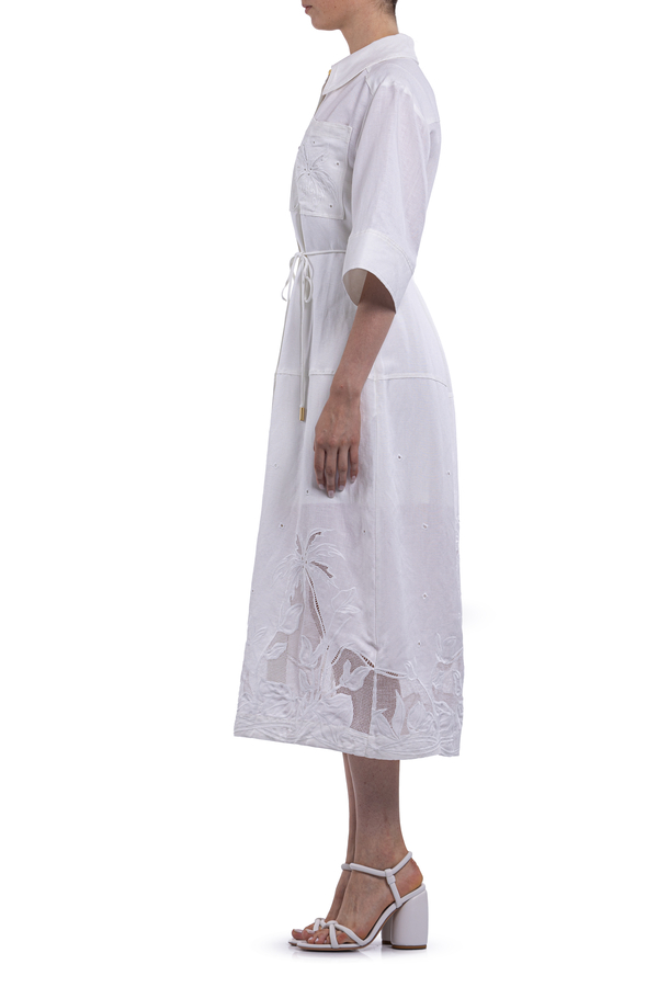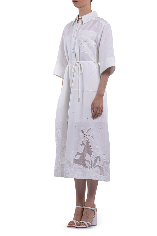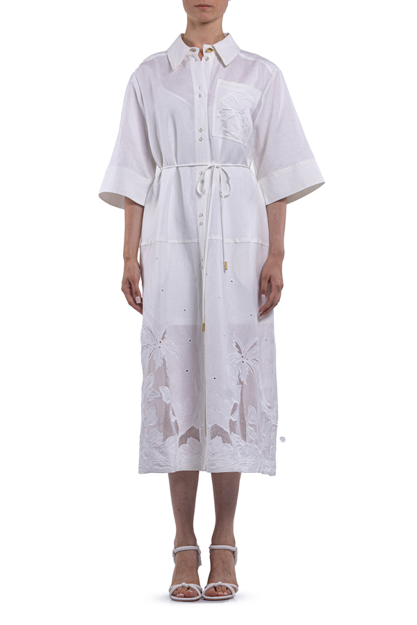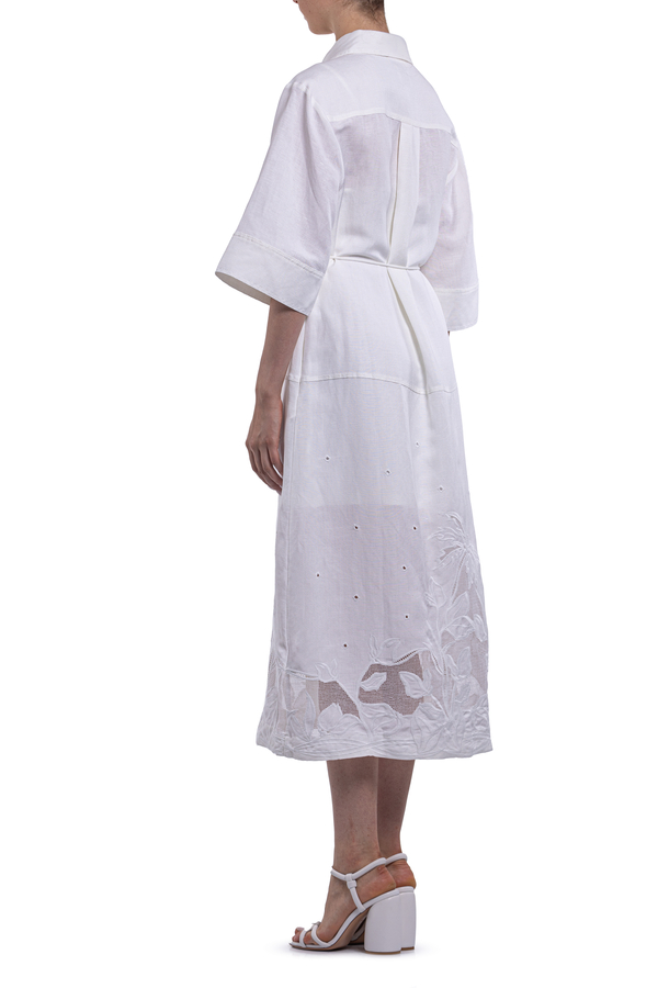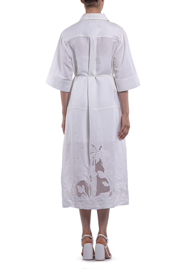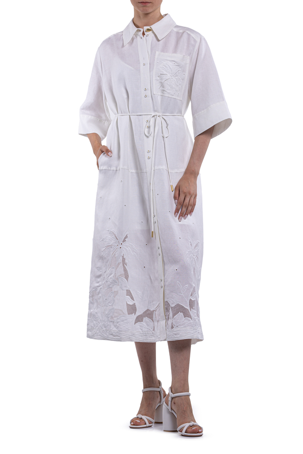 - Платье с цветочной вышивкой, классический воротник, застежка на пуговицы спереди, пояс на талии, накладной карман на груди, рукава три четверти