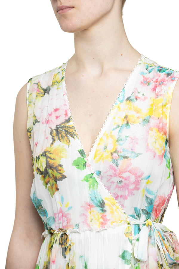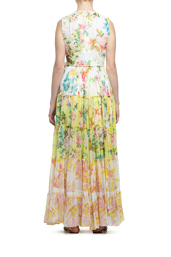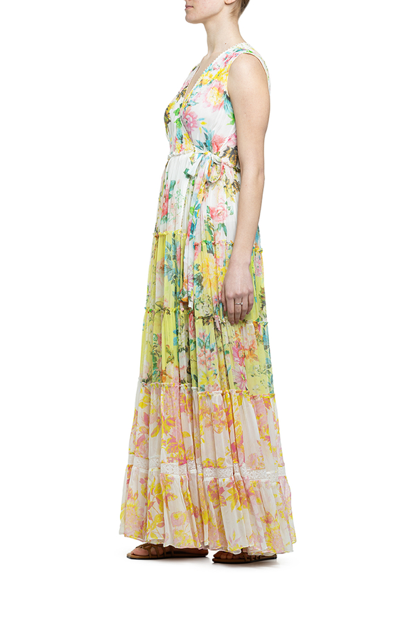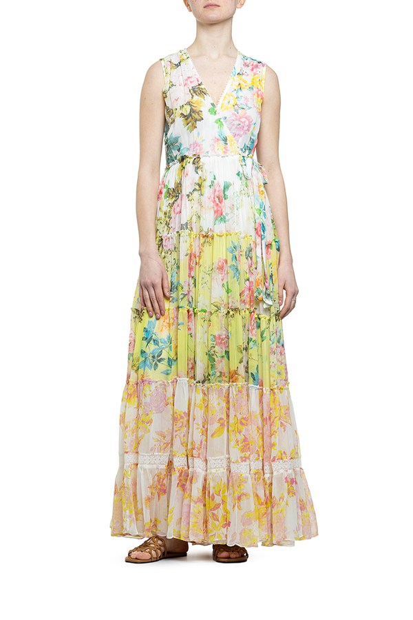 - Сукня довга без рукавів, багато оборок, жовта у квітах на запах