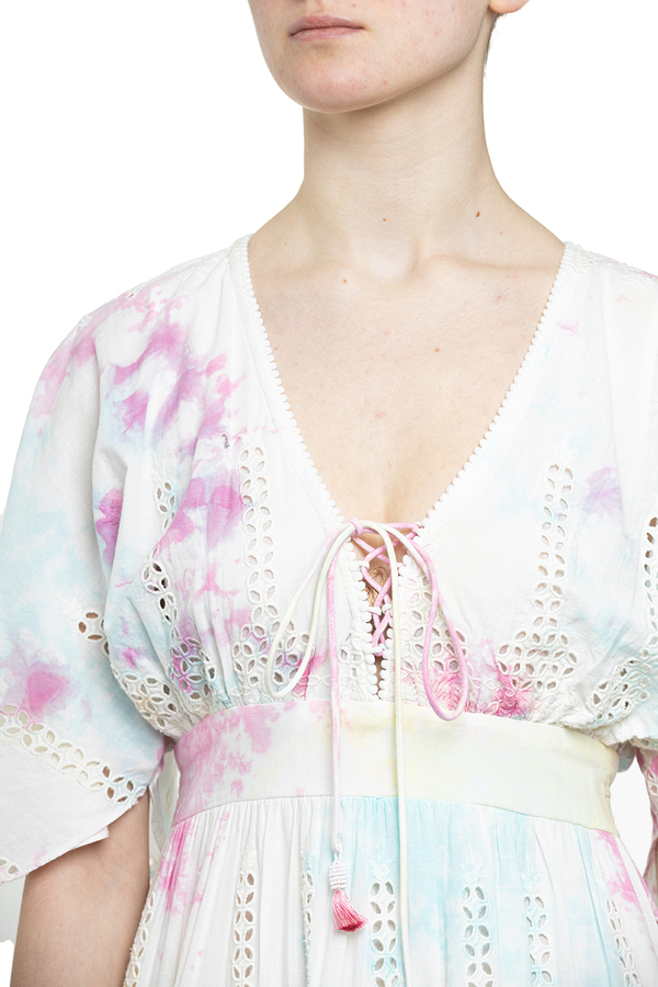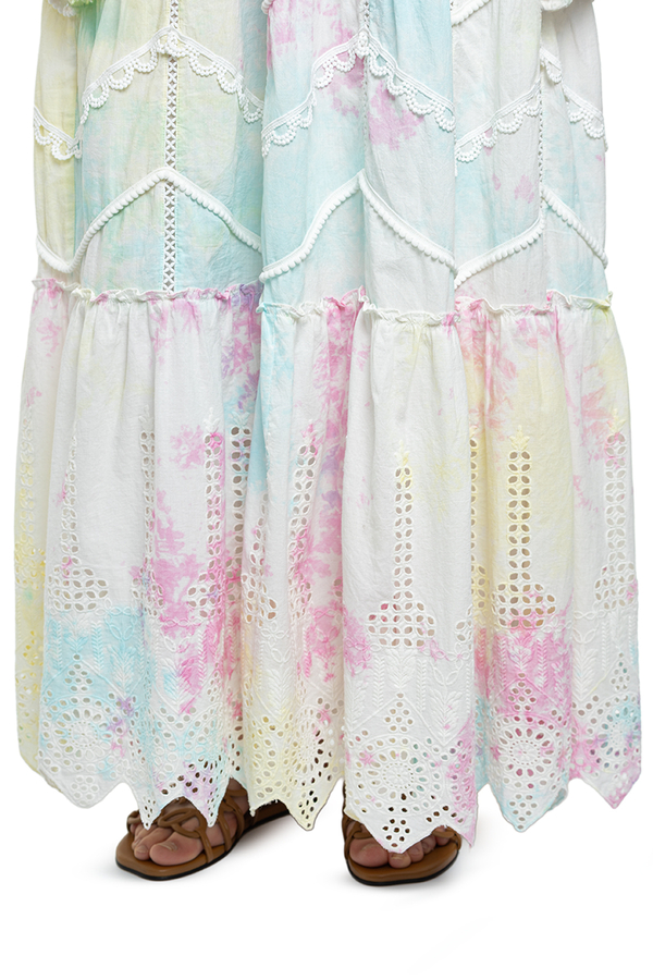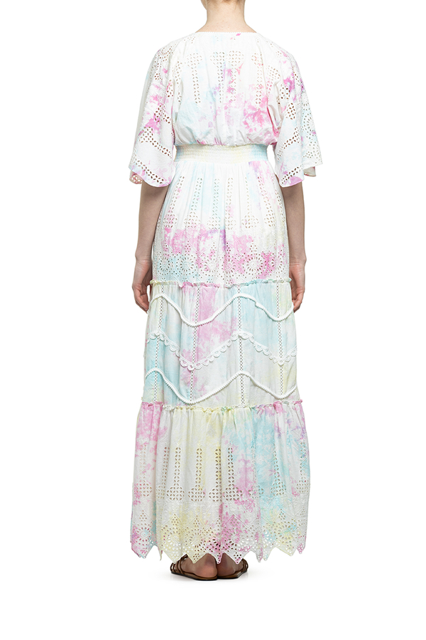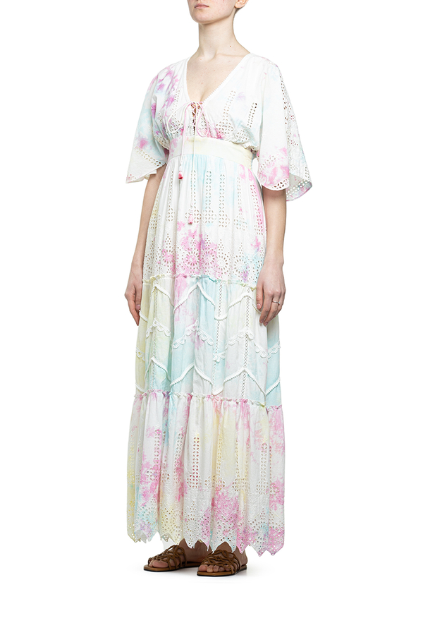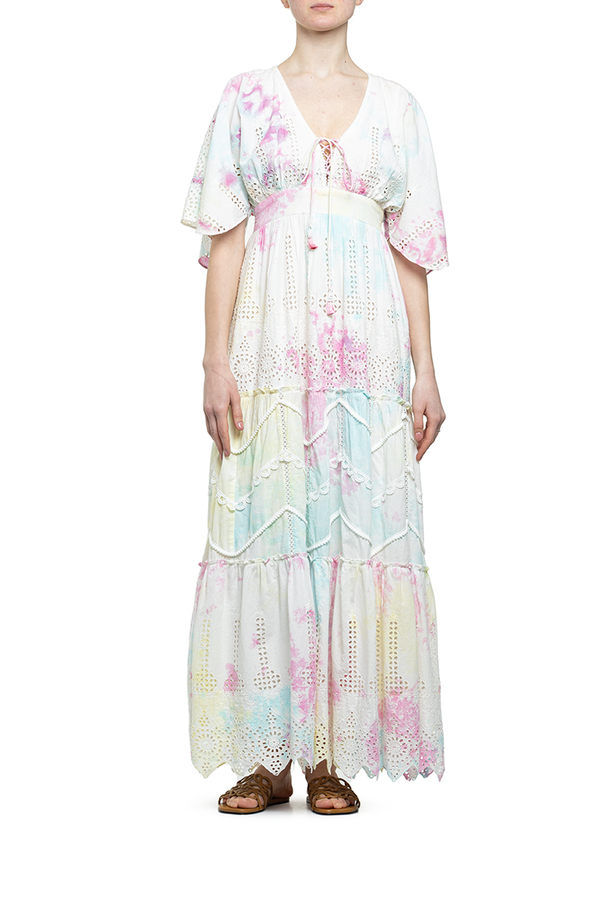 - Сукня довга біла, багато оборок у різнокольорових візерунках