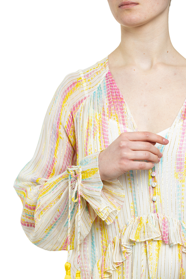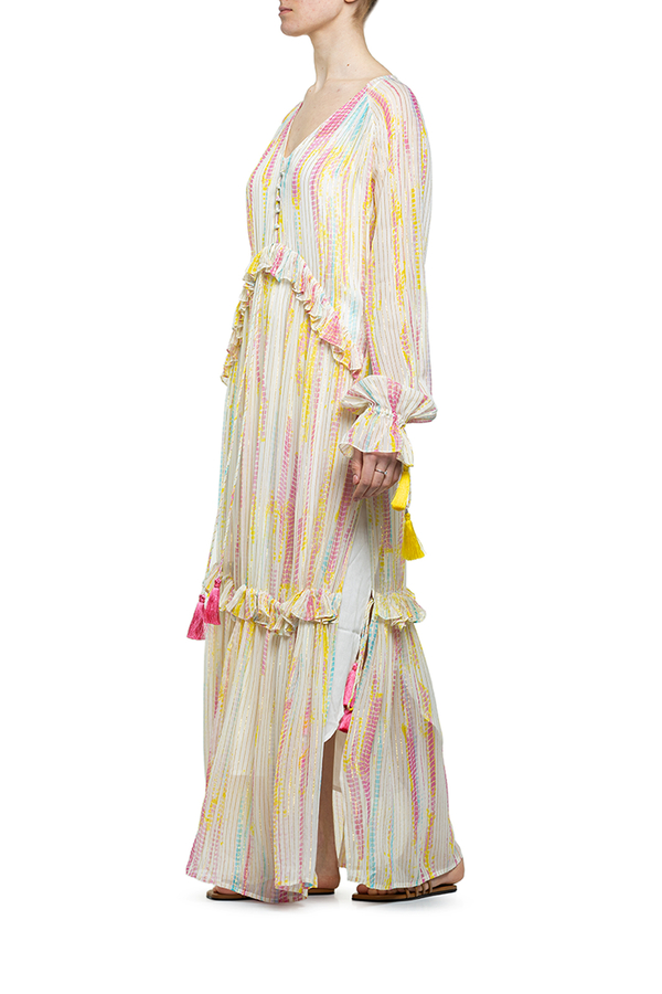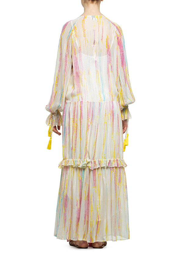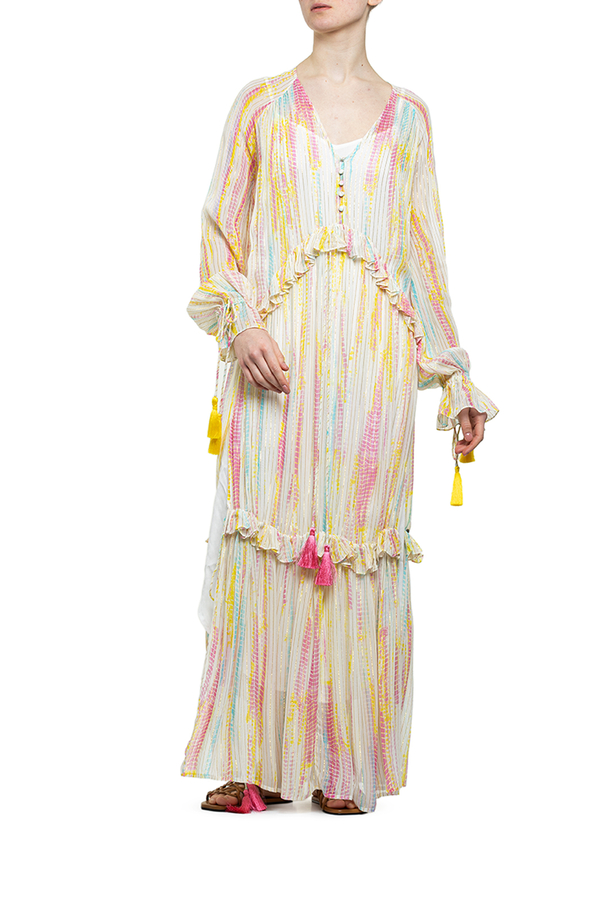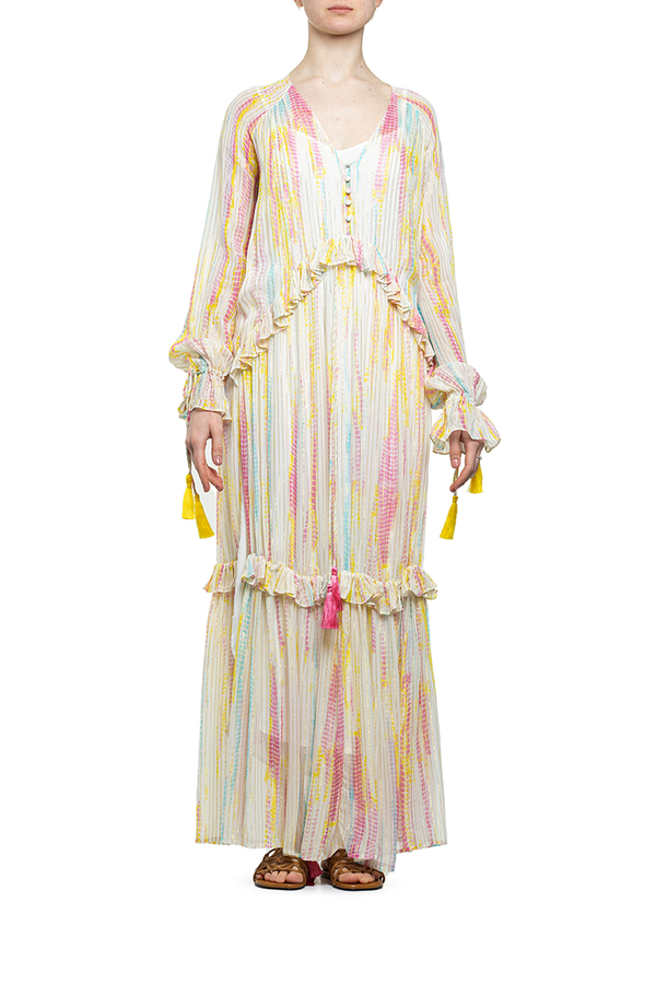 - Сукня з різнокольоровими смугами та люрексом, довгий рукав