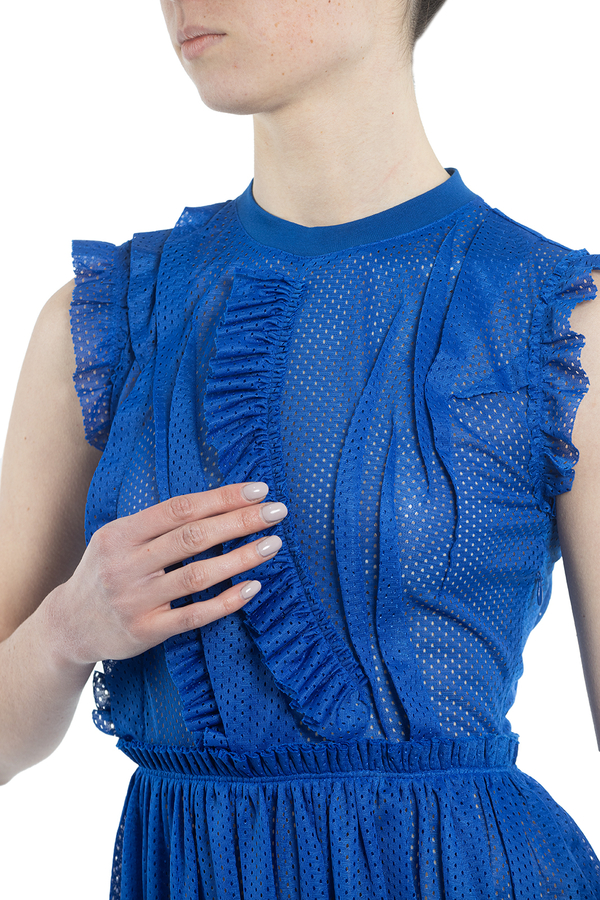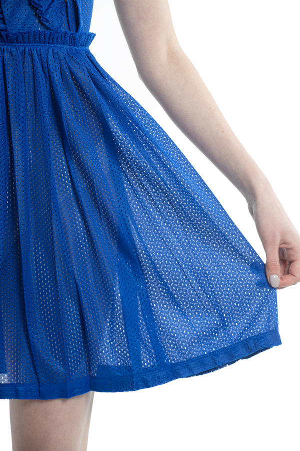 - Міні-сукня оздоблена перфорацією і рюшами.