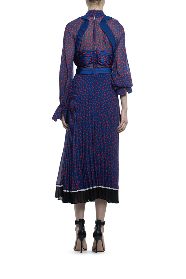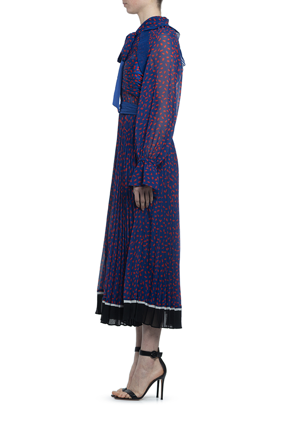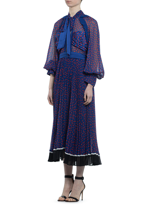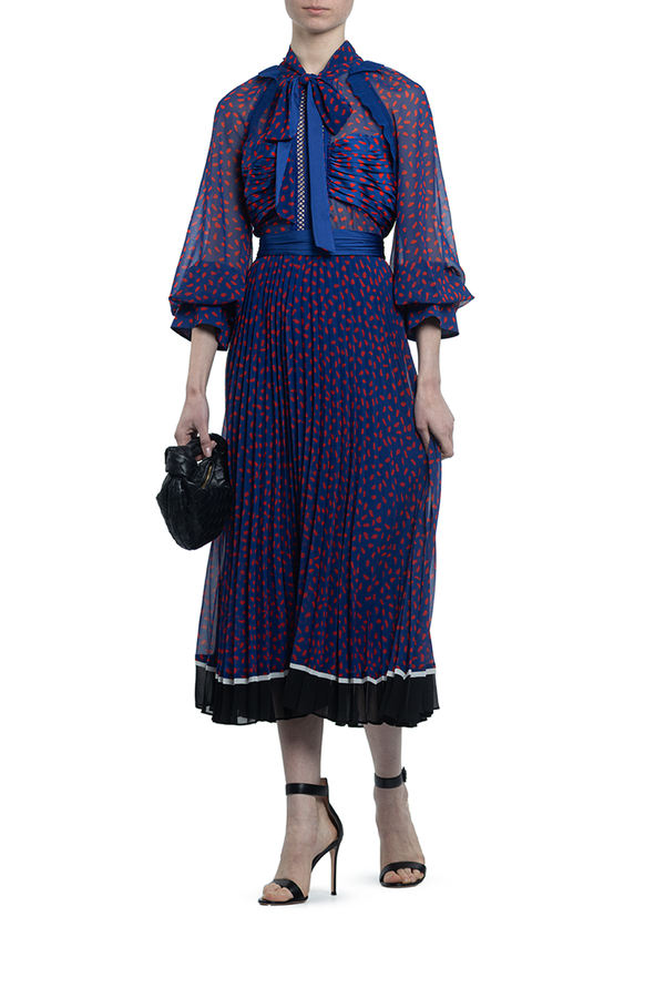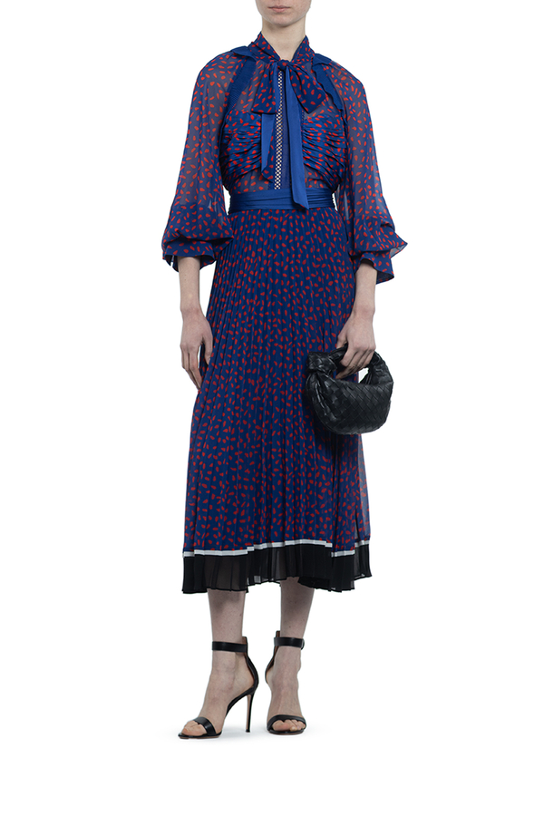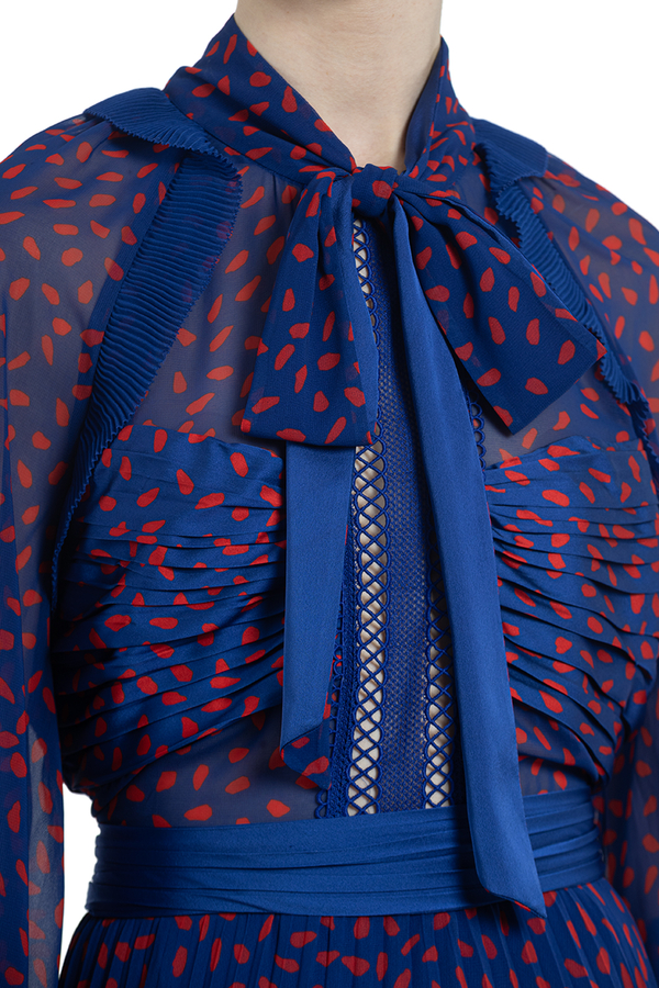 - Сукня з довгими рукавами з принтом червоних цяток по всій поверхні. Середньої довжини, комір з бантом, контрастна стрічка на талії. Спідниця плісе з контрастним оздобленням знизу.
