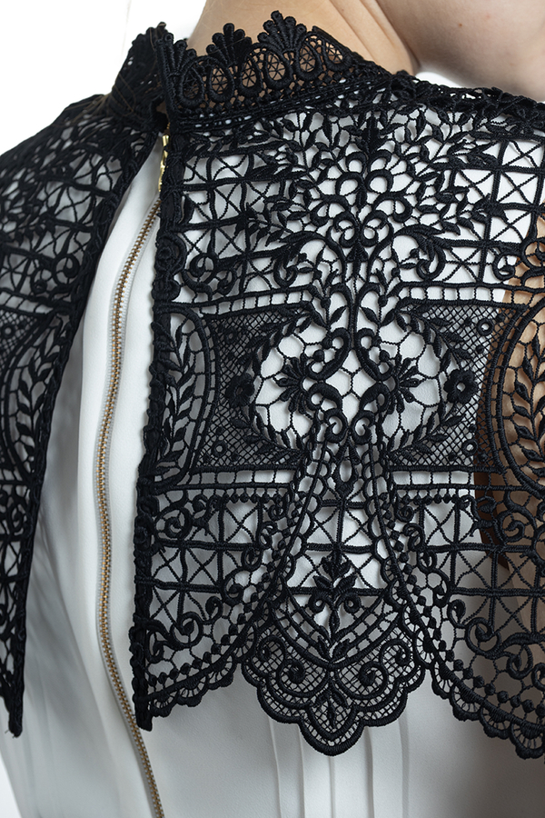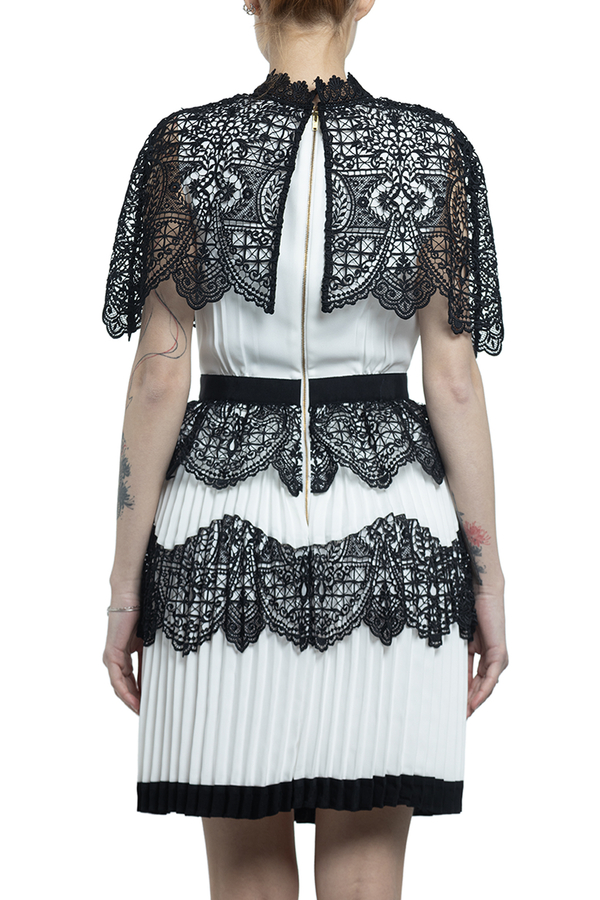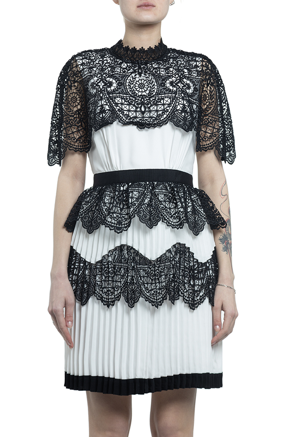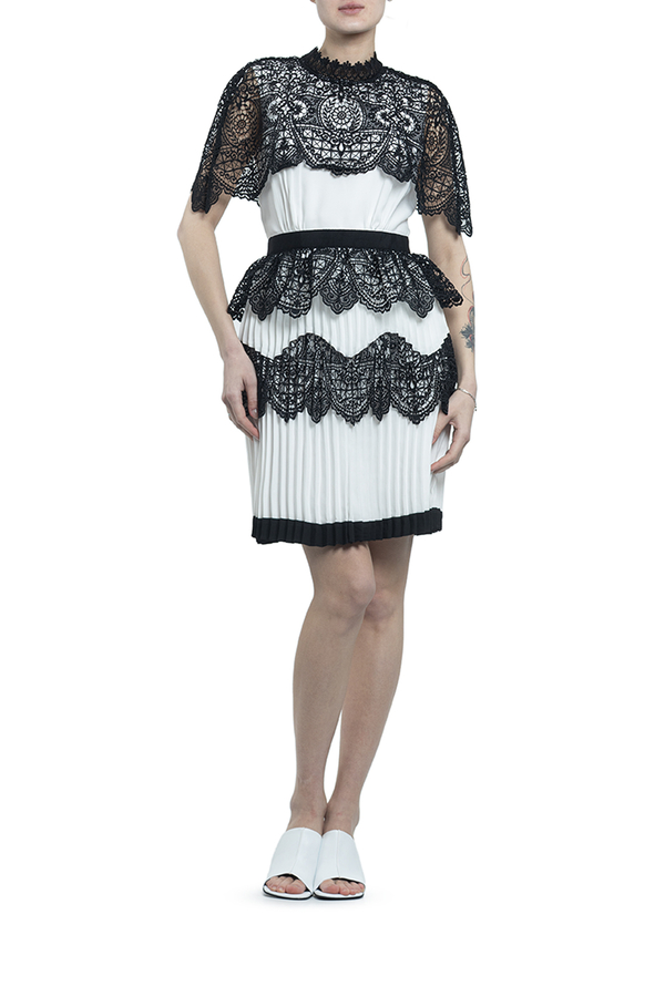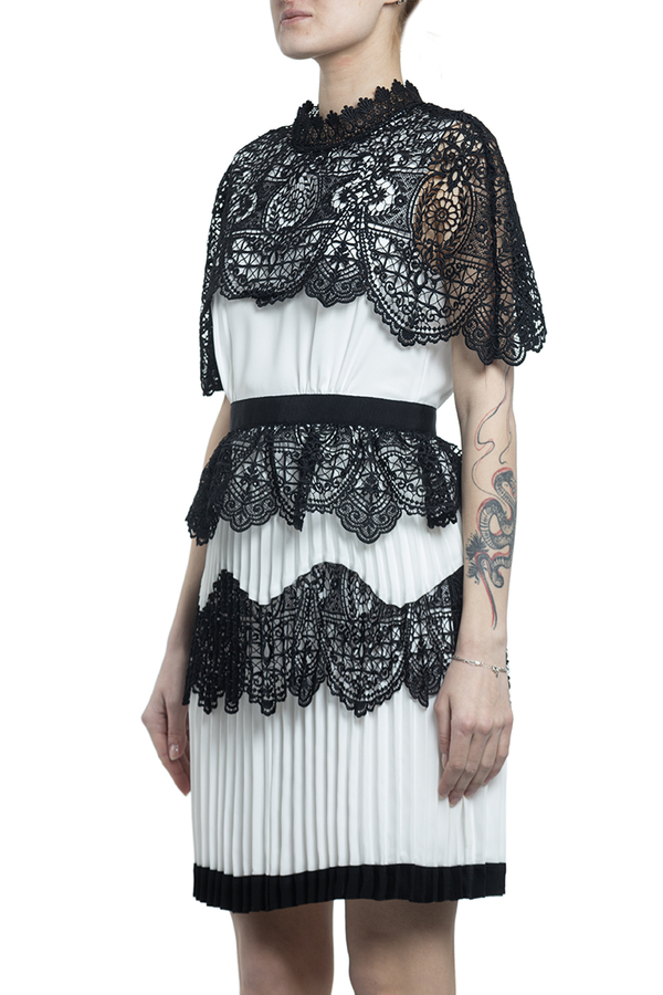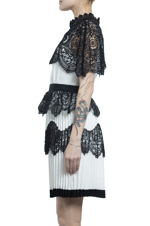 - Коротка сукня з спідницею плісе. Оздоблена чорним широким мереживом. Високий комір і застібка на блискавку ззаду.