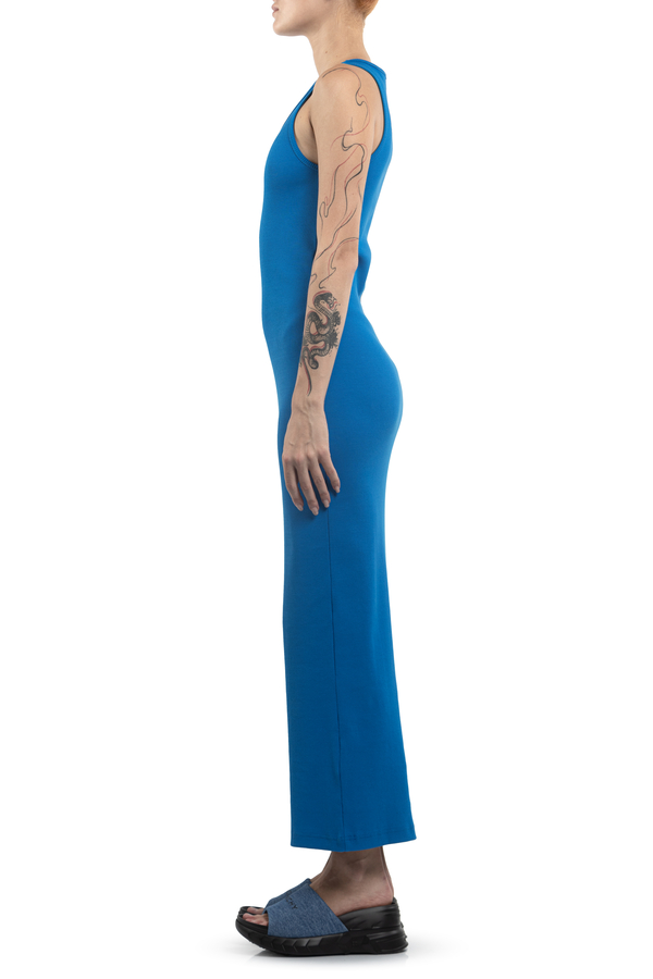 - Довга сукня в рубчик, круглий виріз, приталений крій, металевий логотип спереду