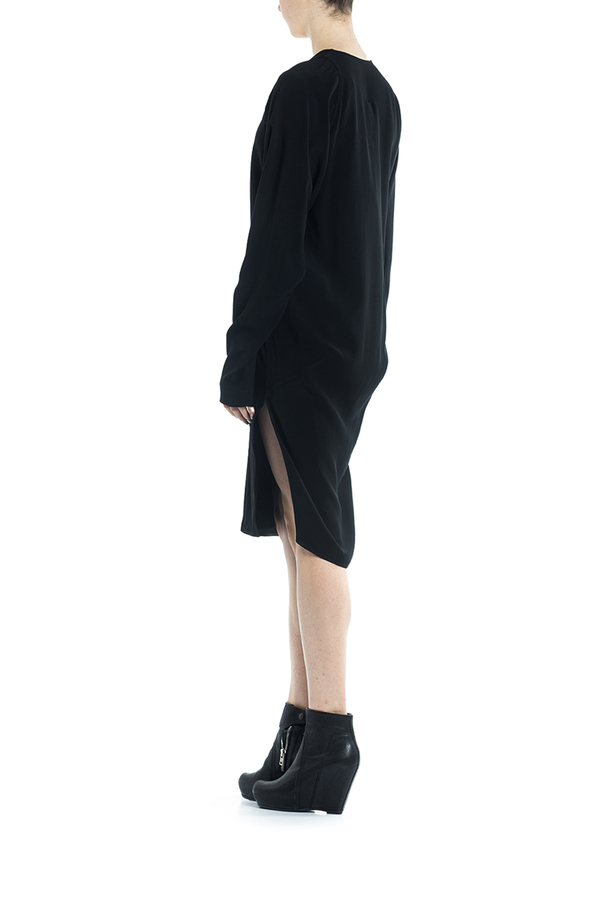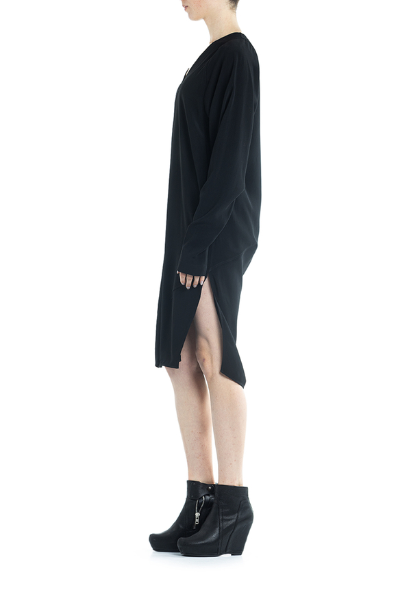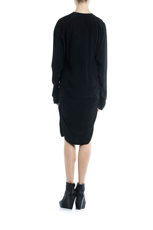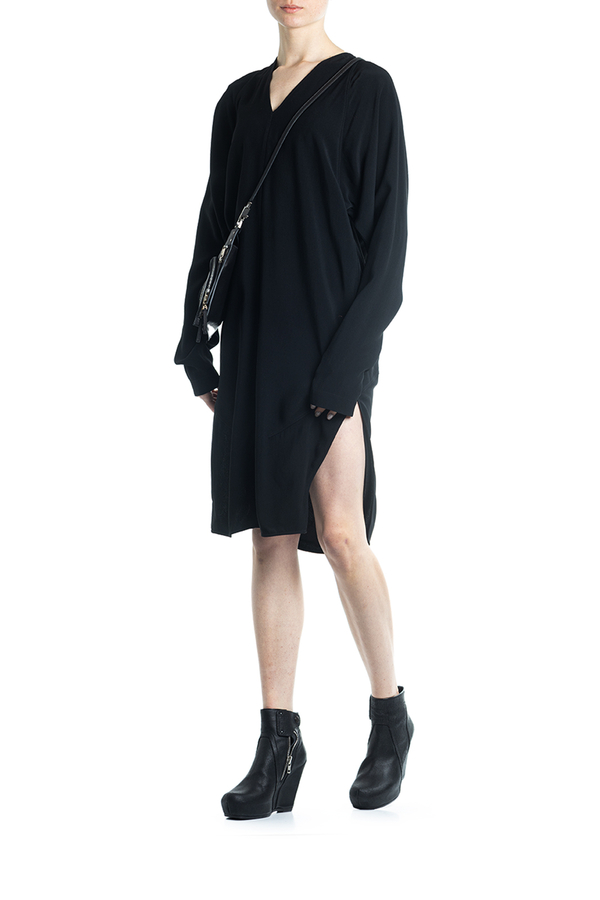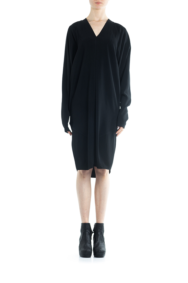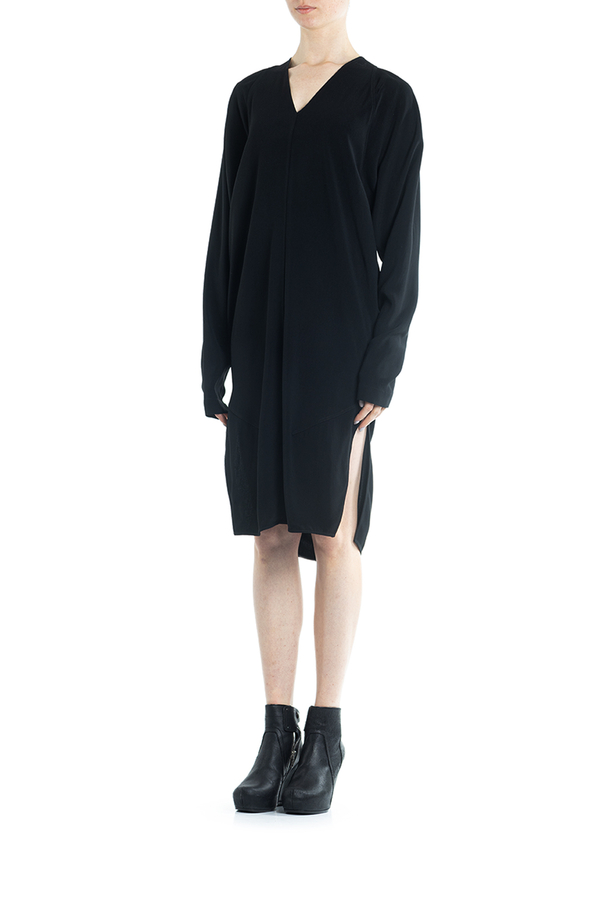 - Сукня з довгими рукавами середньої довжини. З драпіровкою і дизайном оверсайз, розрізи з боків, V-подібна горловина.