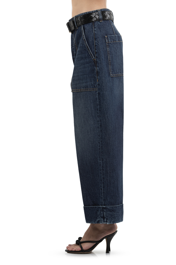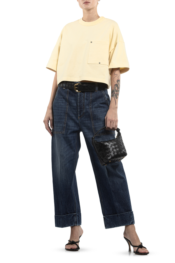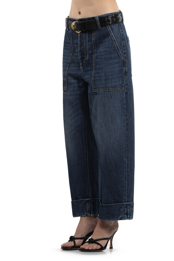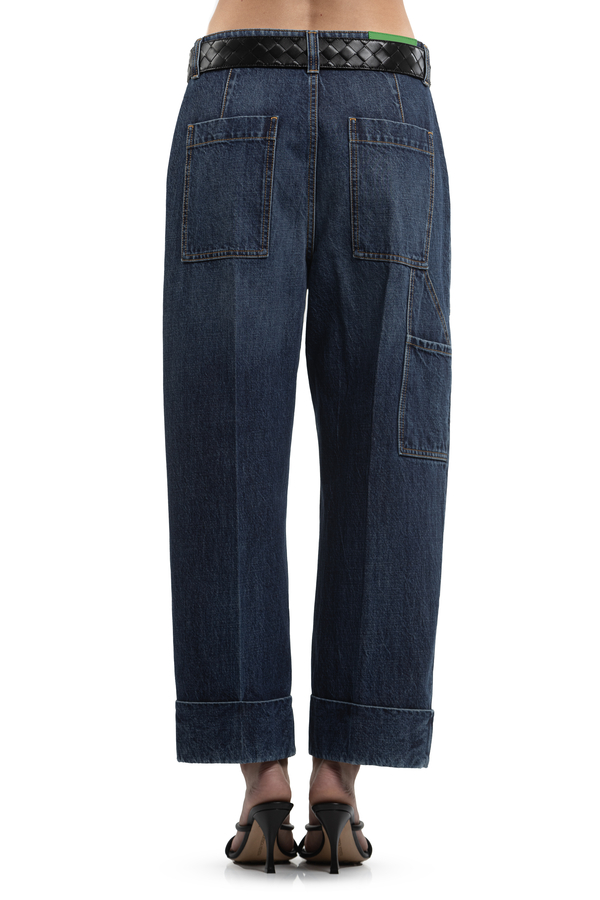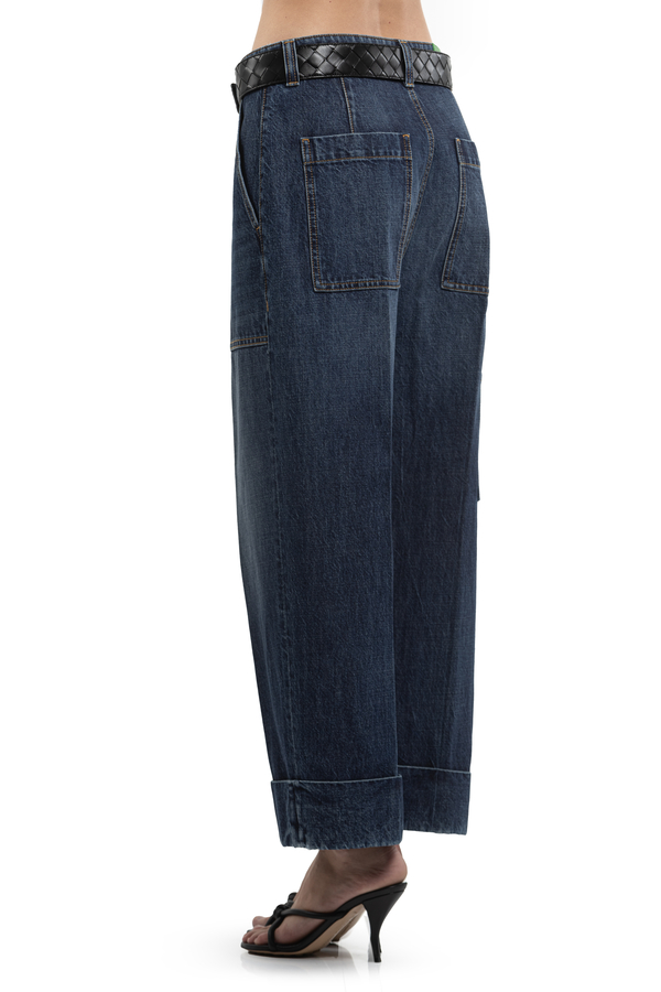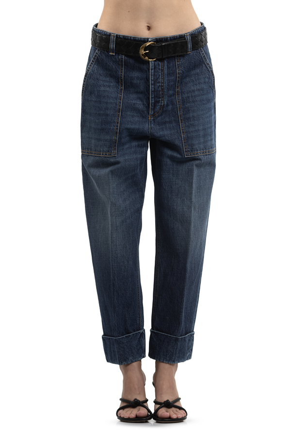 - Джинси з відворотами, ефект потертості, шлевки для ременя, шкіряна вставка ззаду, три бокові та дві задні накладні кишені