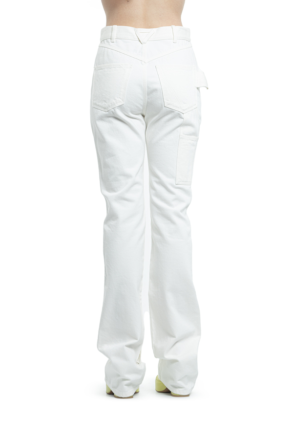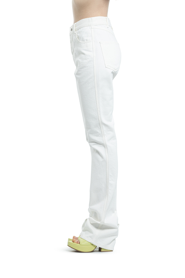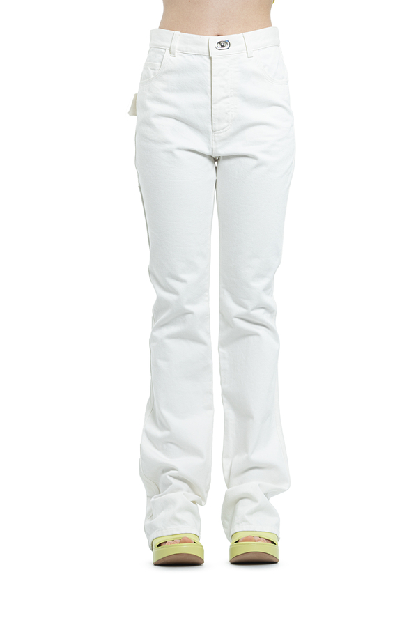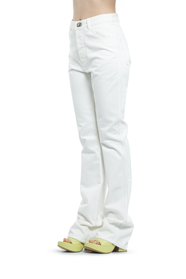 - Розкльошені білі джинси з високою талією. Прихована застібка на блискавку, петлі для пояса.