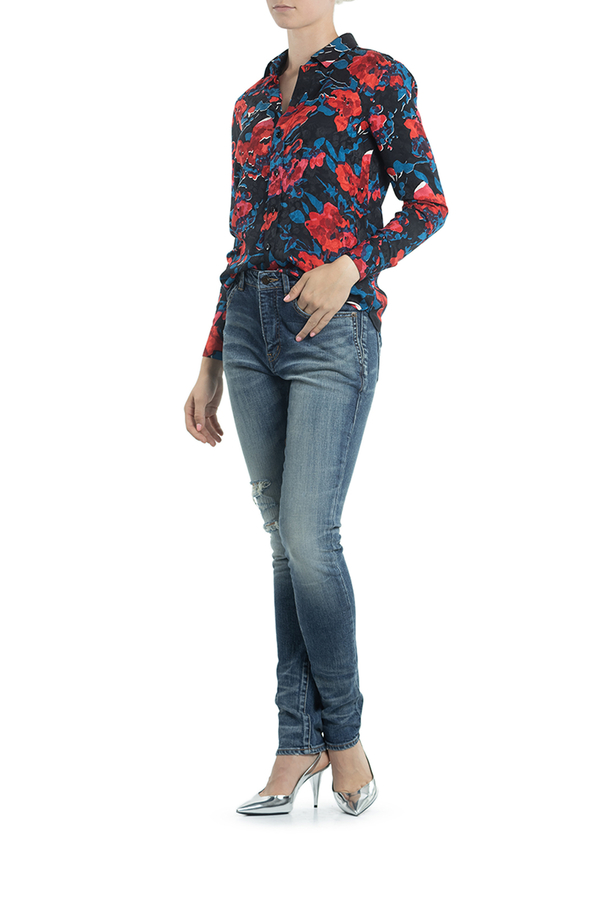 - Джинси вузького крою з декоративними пошкодженнями. Висока талія, шкіряна бірка з логотипом на поясі, застібка на блискавку і гудзик.