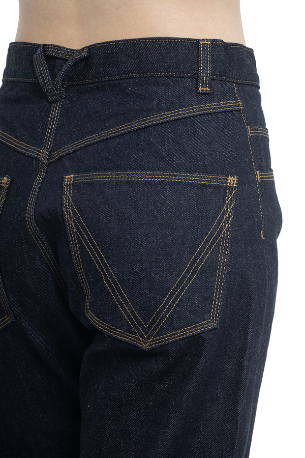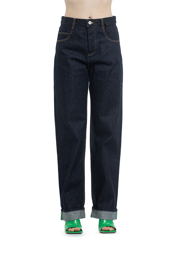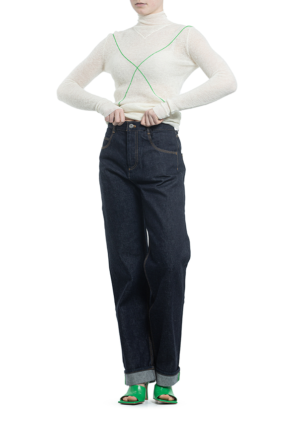 - Джинси с застібкою на гудзики. Підвороти з лампасами, прямий крій, висока талія.