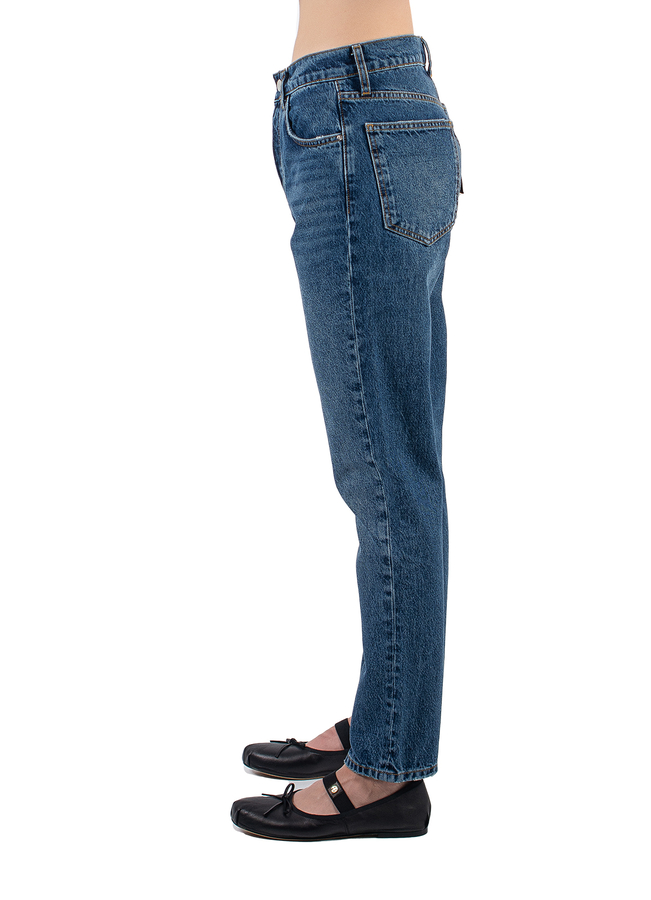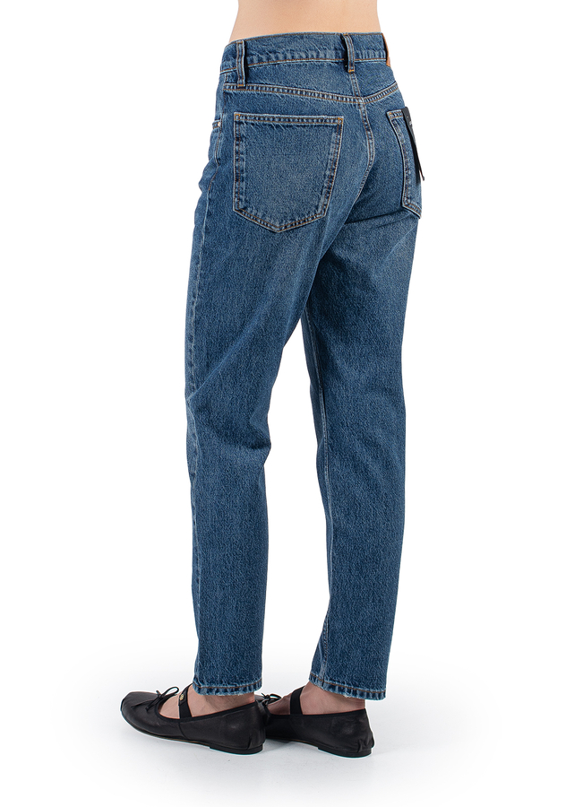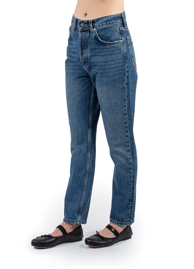 - Джинси прямого крою с застібкою на гудзики. Висока талія, петлі для ременя, модель з п'ятьма кишенями і вкорочена довжина.