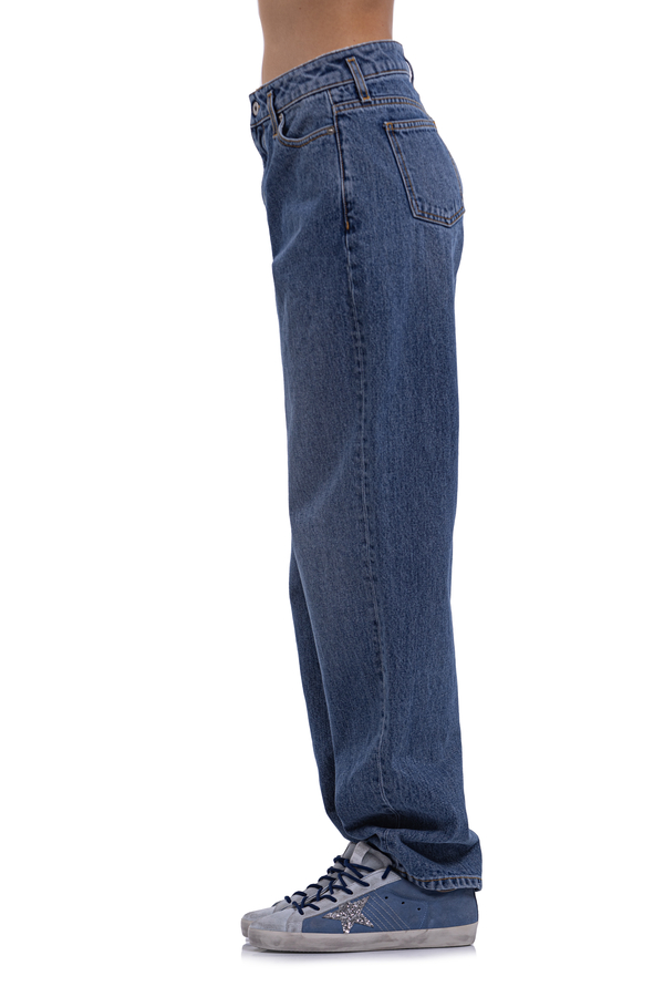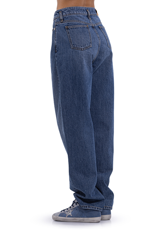 - Широкие прямые джинсы, классические пять карманов, на поясе шлевки для ремня, сзади кожаная вставка с логотипом