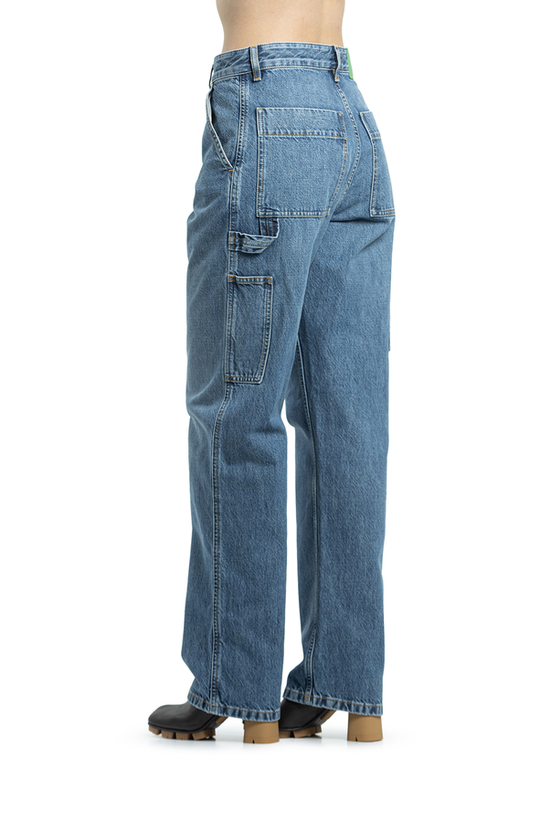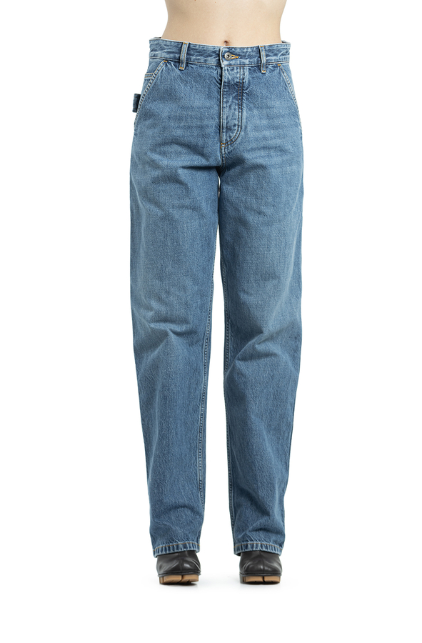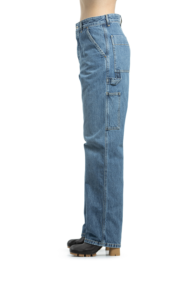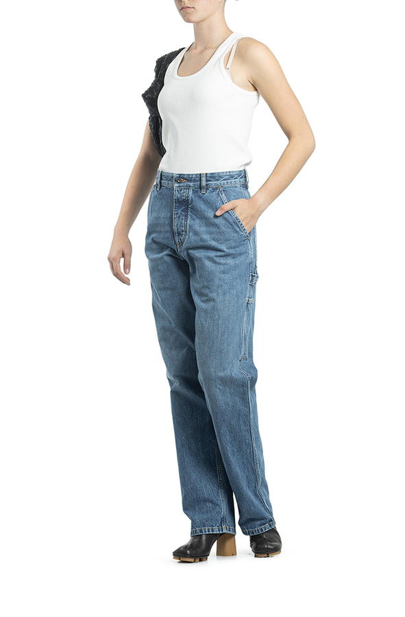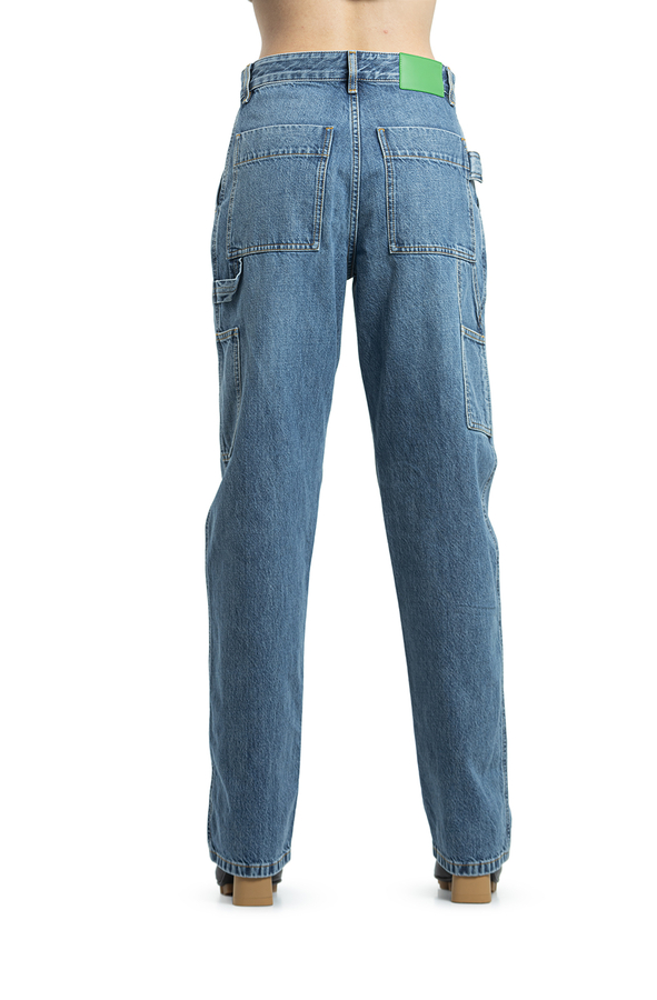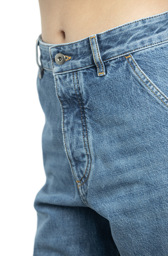 - Джинси з ефектом потертості, застібка на гудзики, шлевки для ременя, прорізні кишені по боках, накладні кишені ззаду та по боках, контрастна шкіряна бірка ззаду