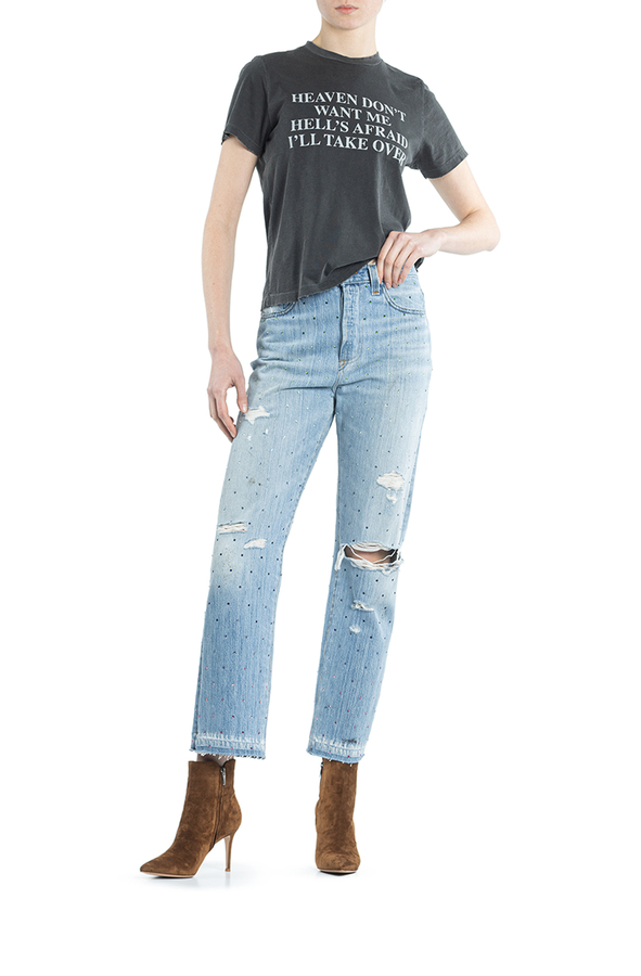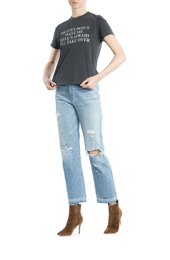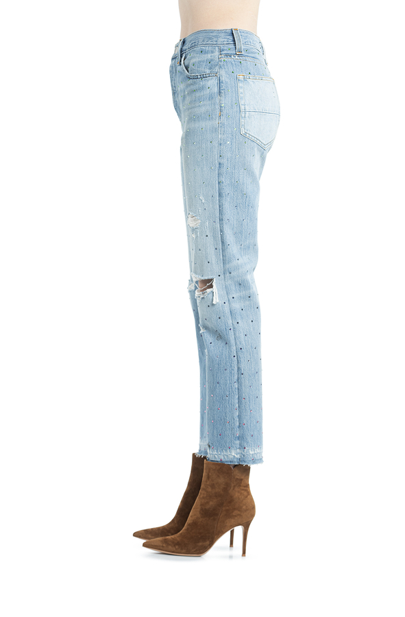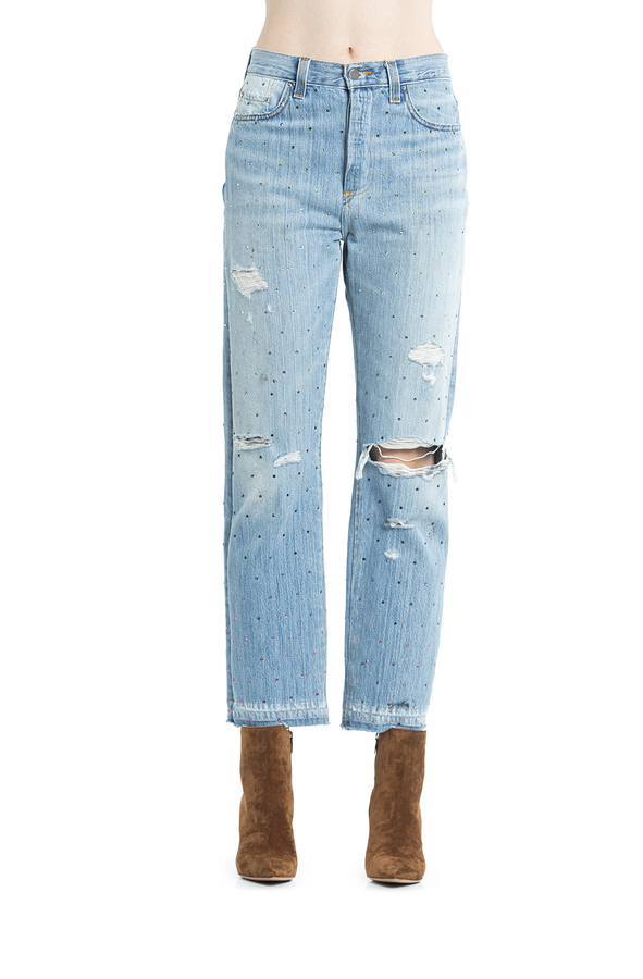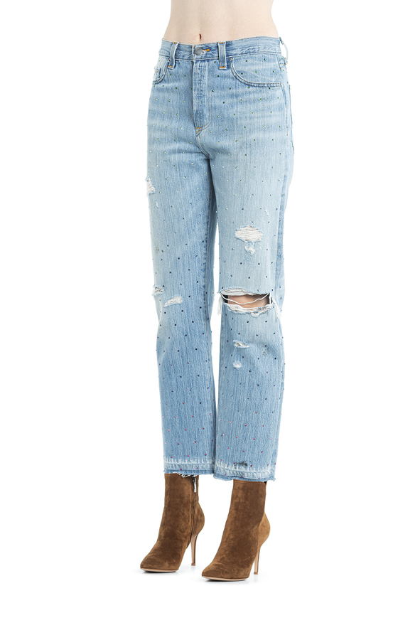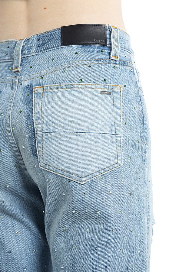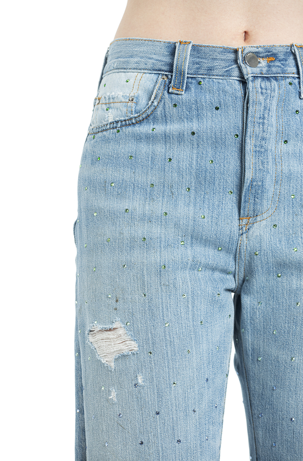 - Джинси широкі рвані. Прикрашені різнокольоровими стразами