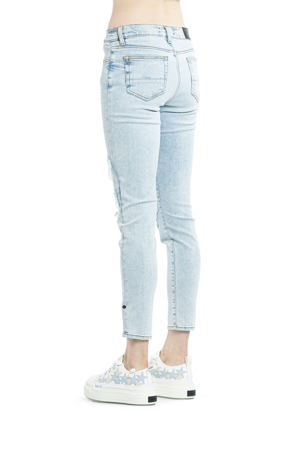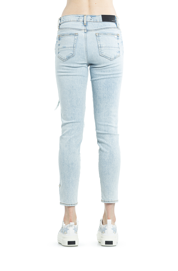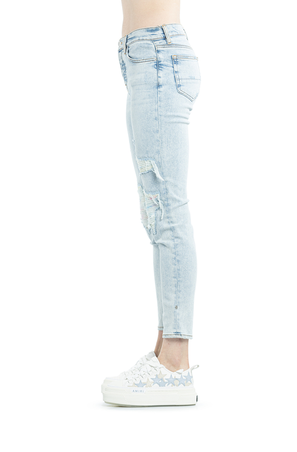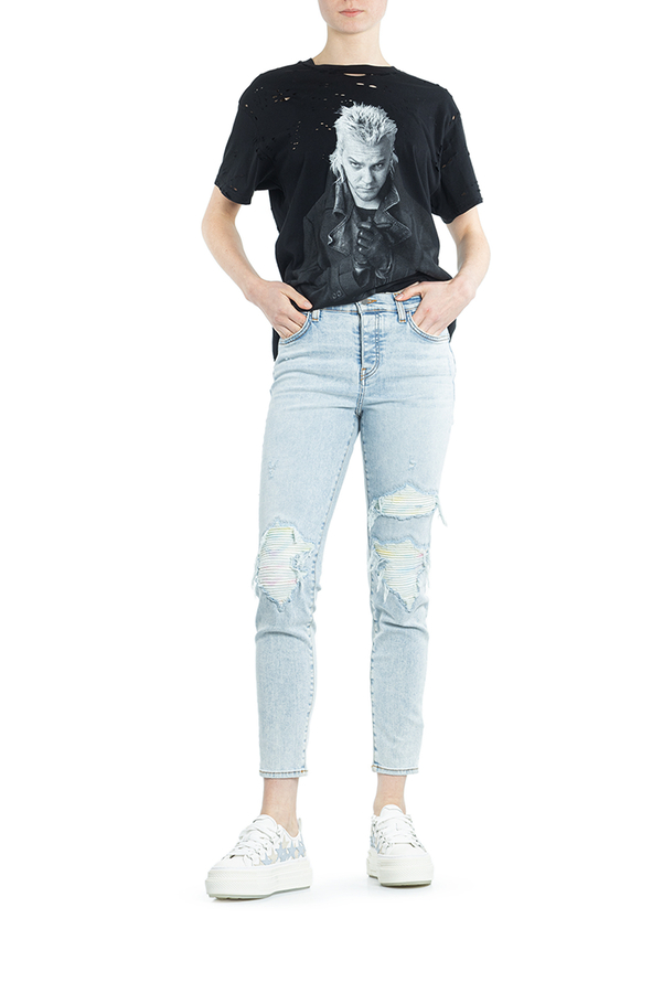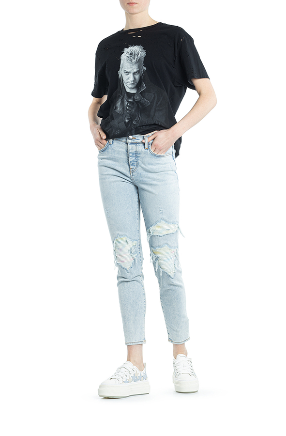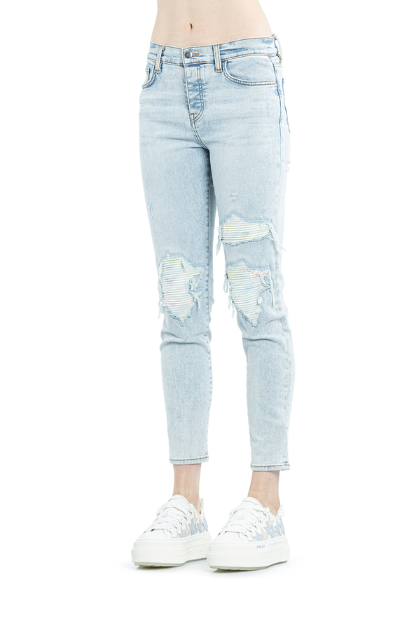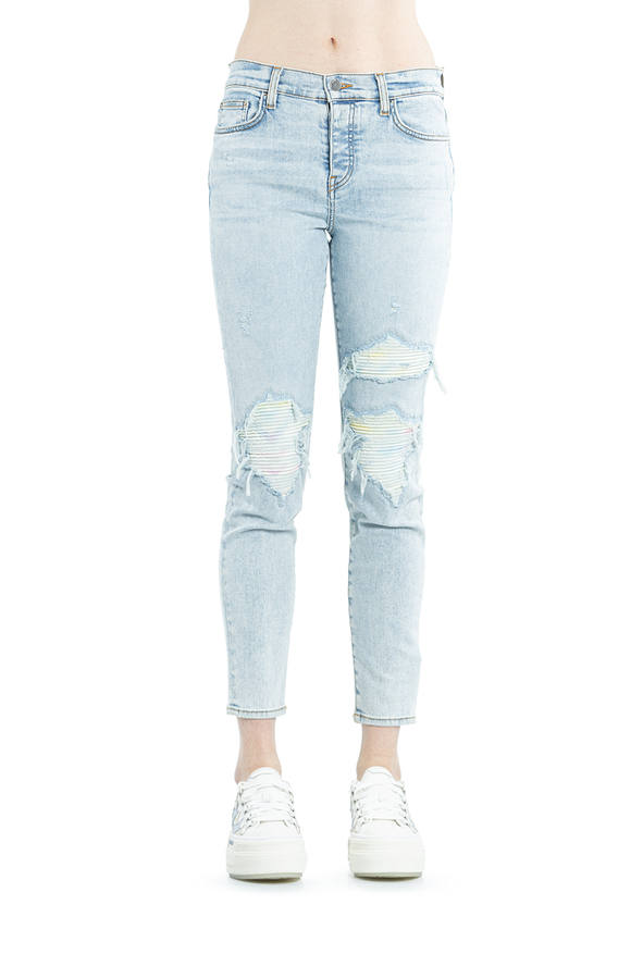 - Джинси завужені рвані. На колінах заплатки з різнобарвноЇ простроченої задрапірованої тканини