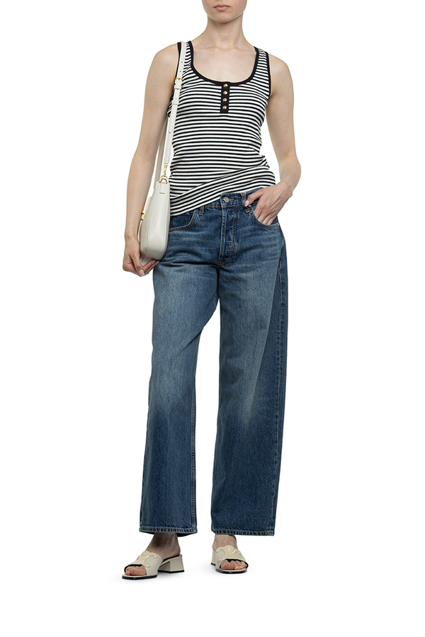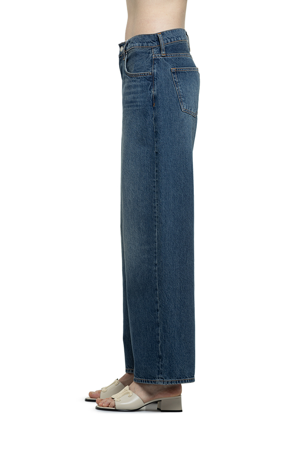- Широкі джинси з класичними п’ятьма кишенями, ефект потертості, шлевки для ременя, нашивка з логотипом ззаду