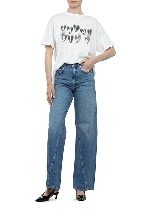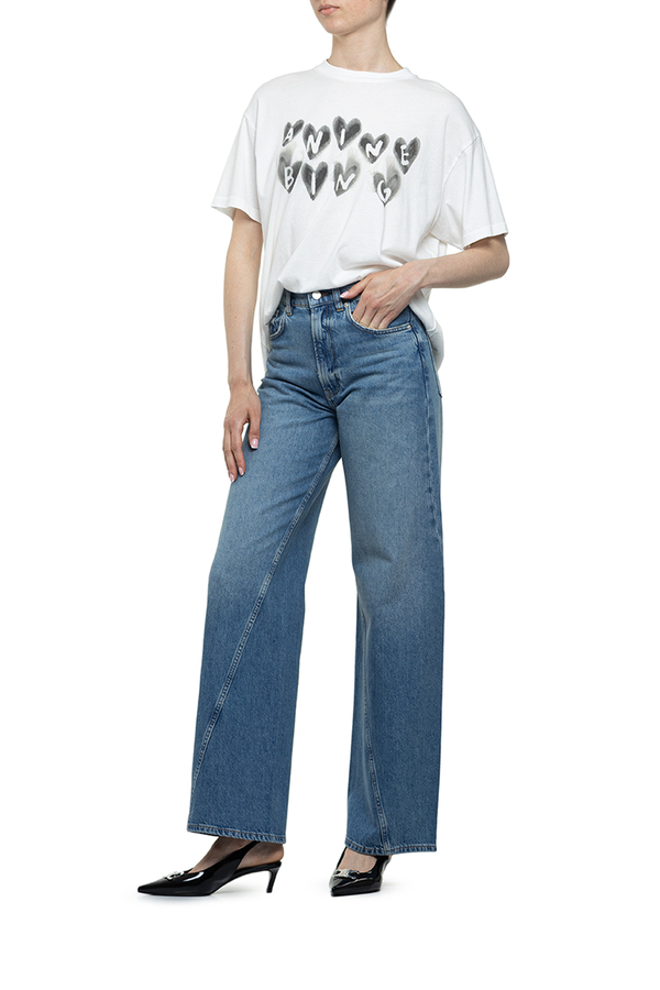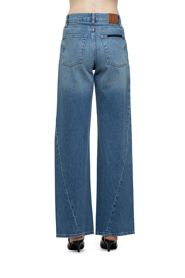 - Широкі джинси з п'ятьма класичними кишенями, застібка на гудзики спереду, нашивка з логотипом позаду