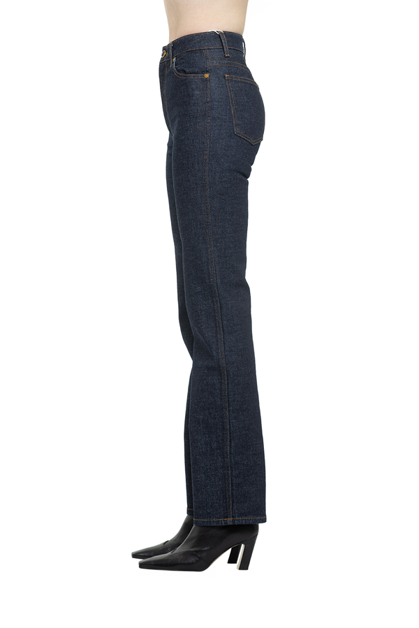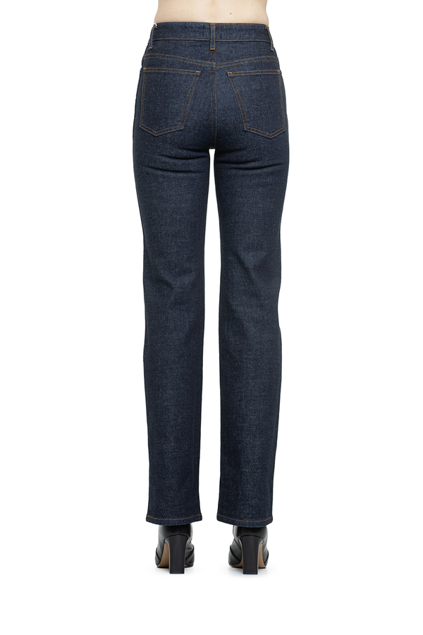 - Джинсы с классическими пятью карманами, контрастные швы, петли для ремня, застежка на пуговицу и молнию