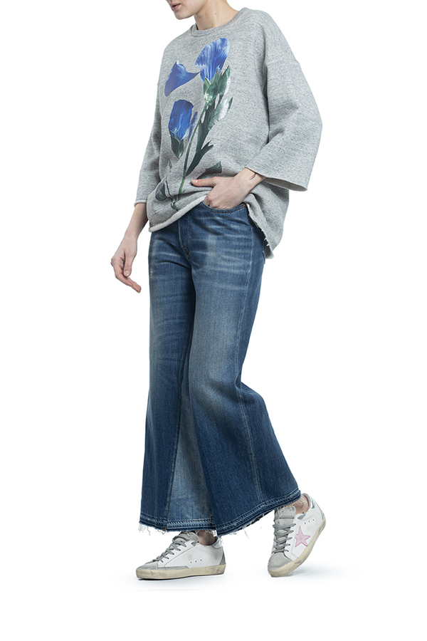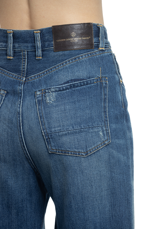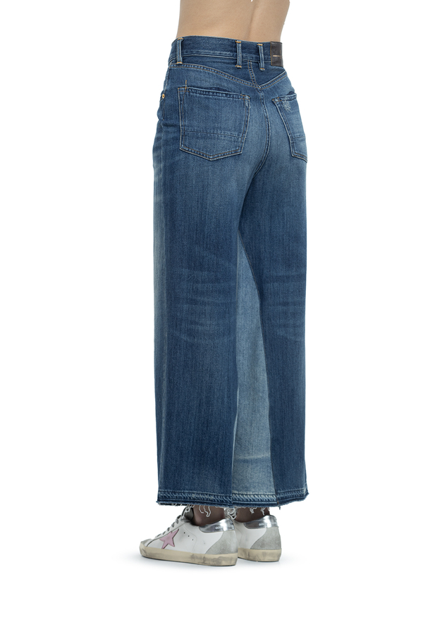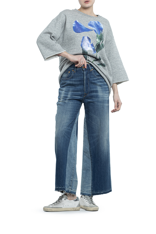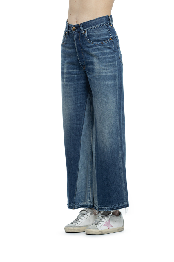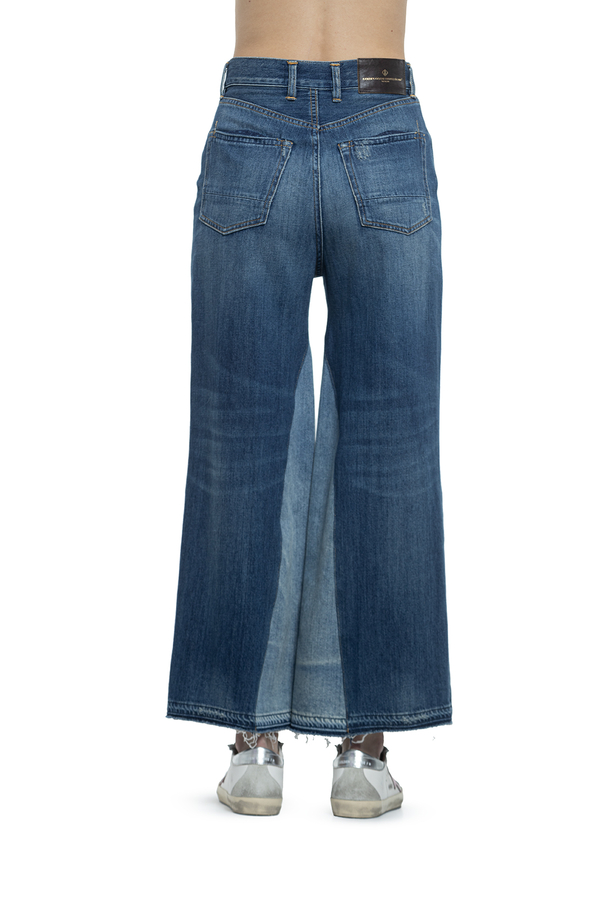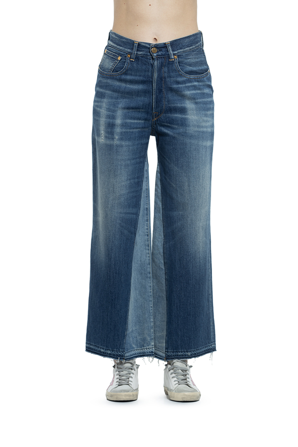 - Джинси широкого крою з високою лінією талії. Вставки з контрасного деніму, застібка на гудзиках.