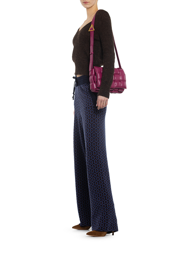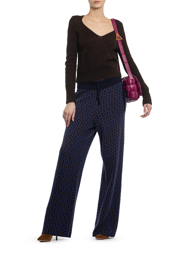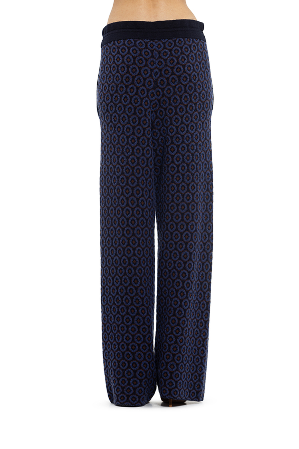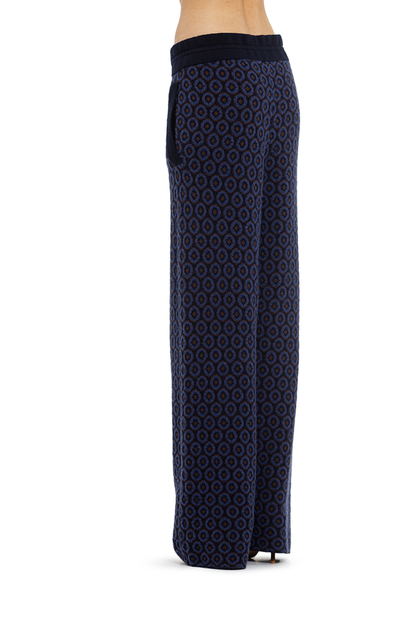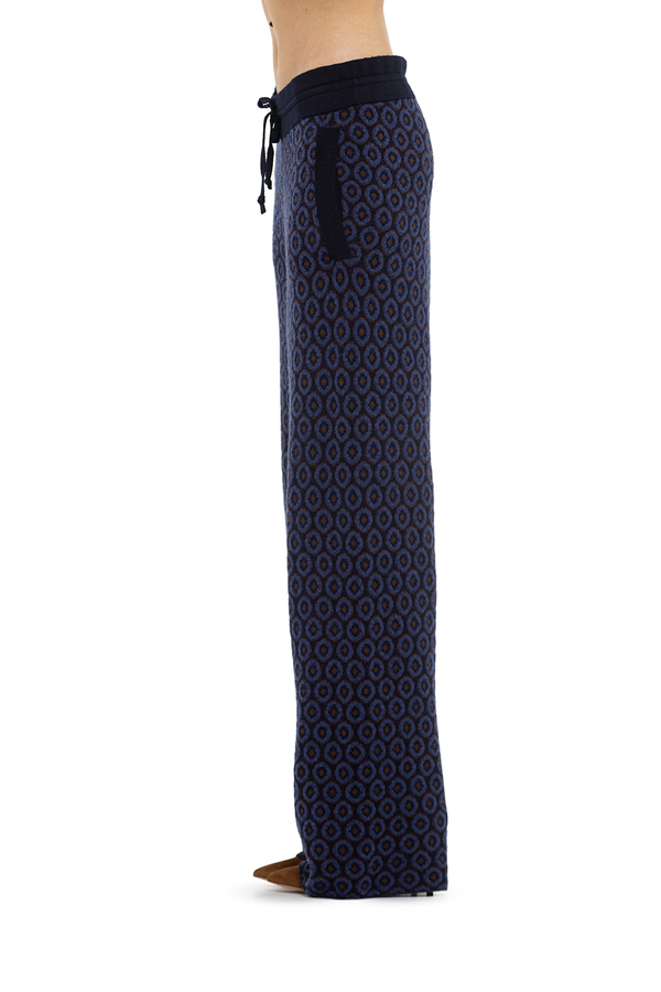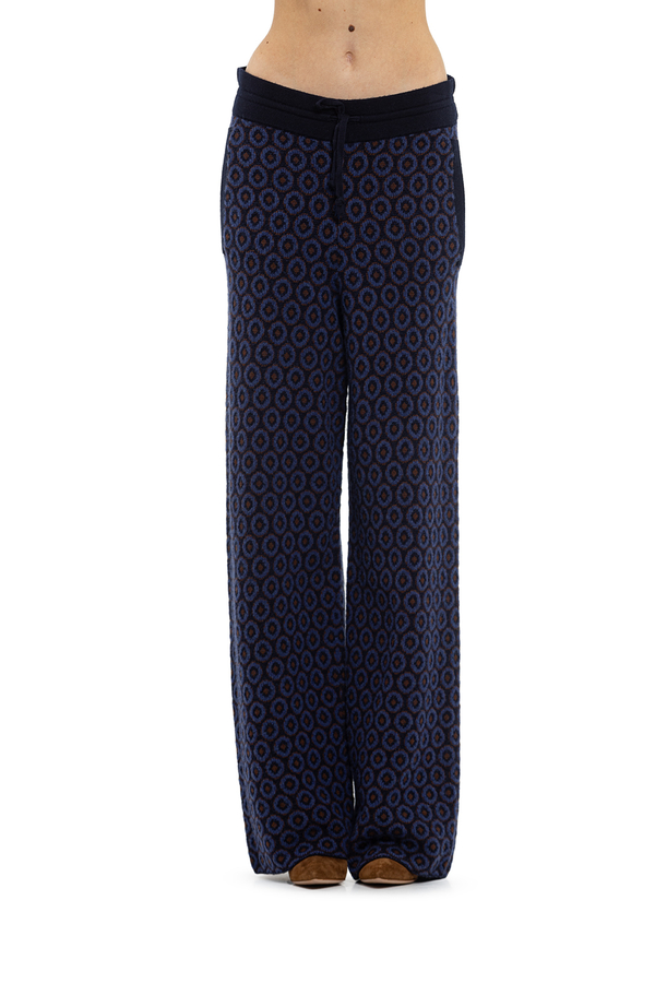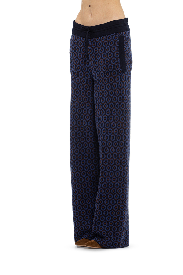 - Спортивні в'язані штани, широкого крою, застібка на куліску. Геометричний візерунок в темно-синіх тонах.