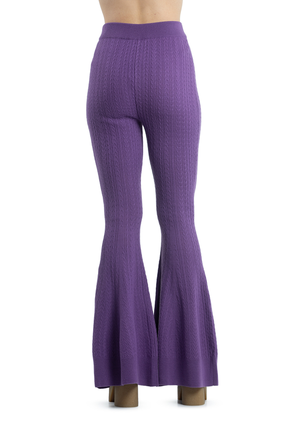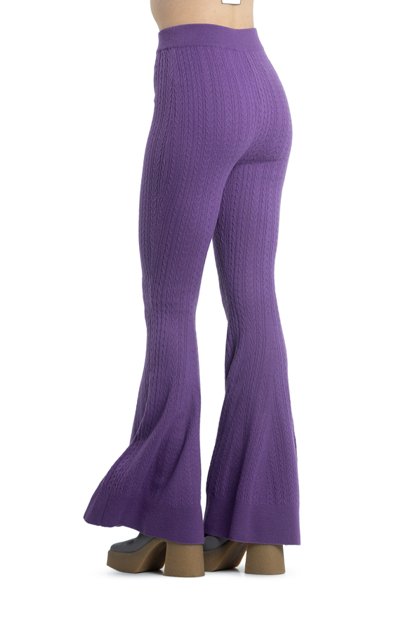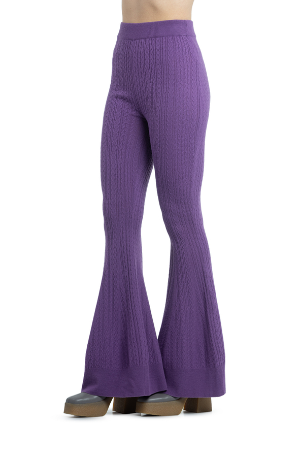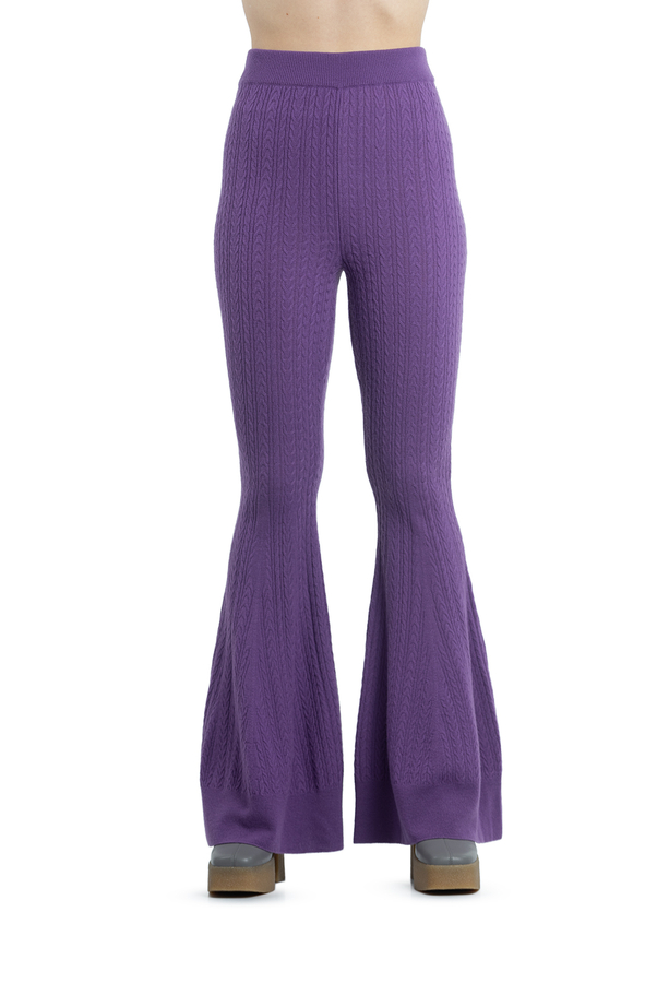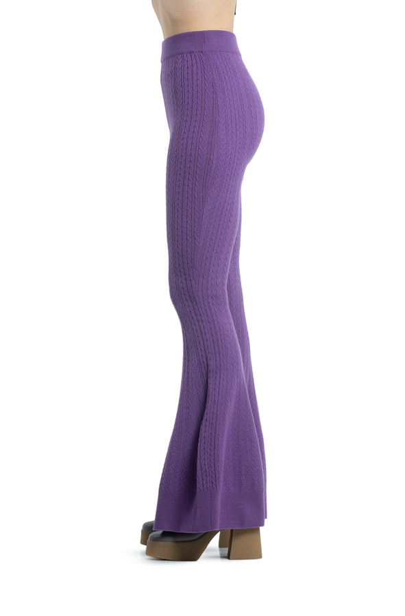 - Трикотажні штани на еластичному поясі, розкльошені до низу. Фактура тканини - в'язані дрібні косички.