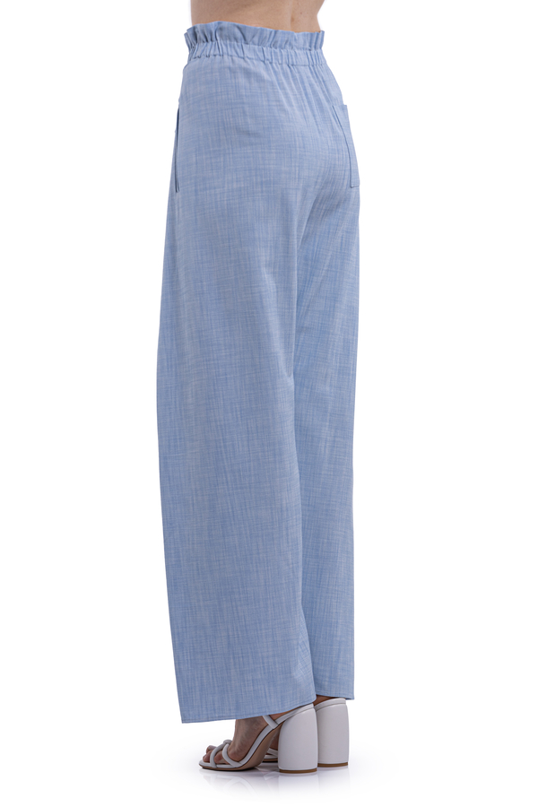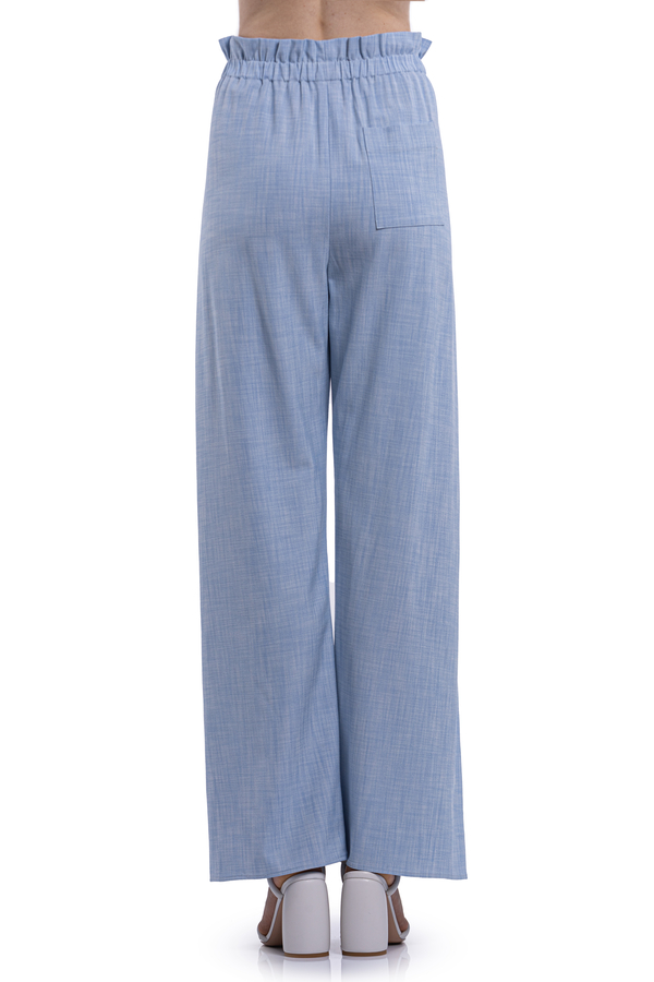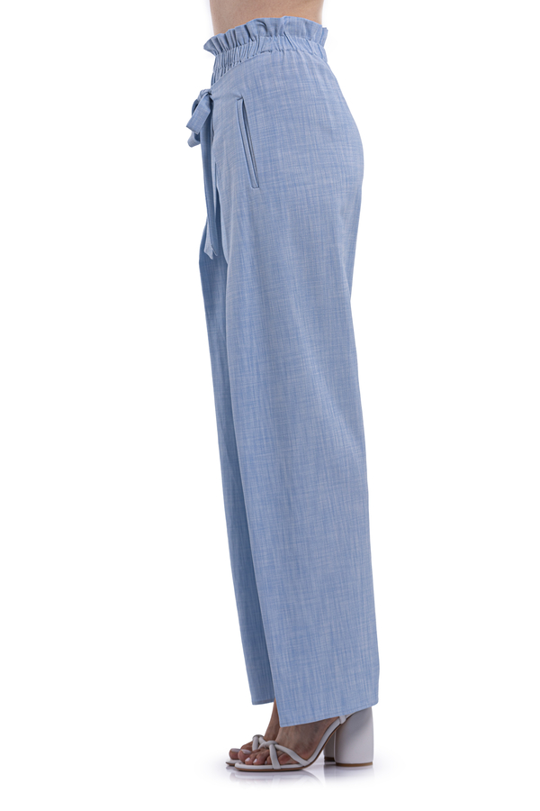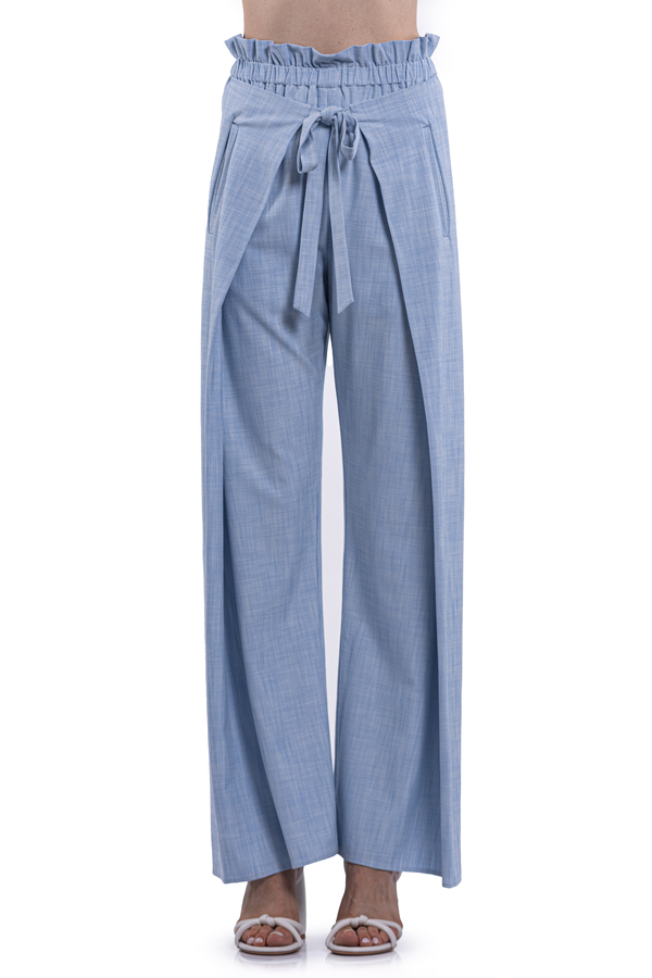 - Брюки с эластичным поясом, спереди спускающаяся ниже талии завязка, создающая эффект обертывания, эластичный пояс, два боковых кармана, сзади накладной карман