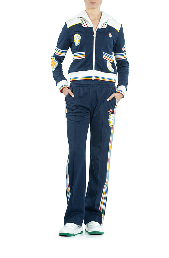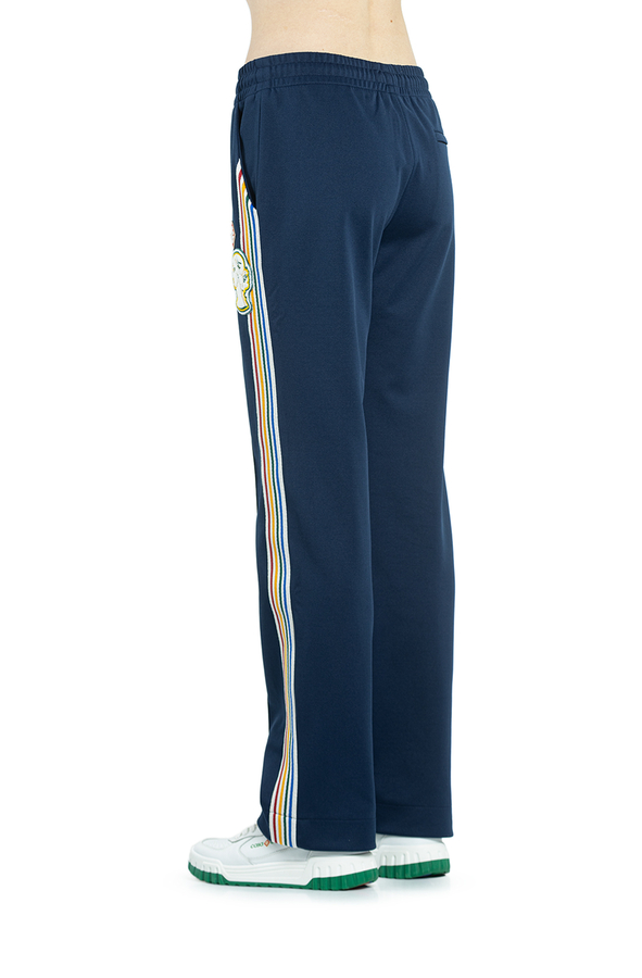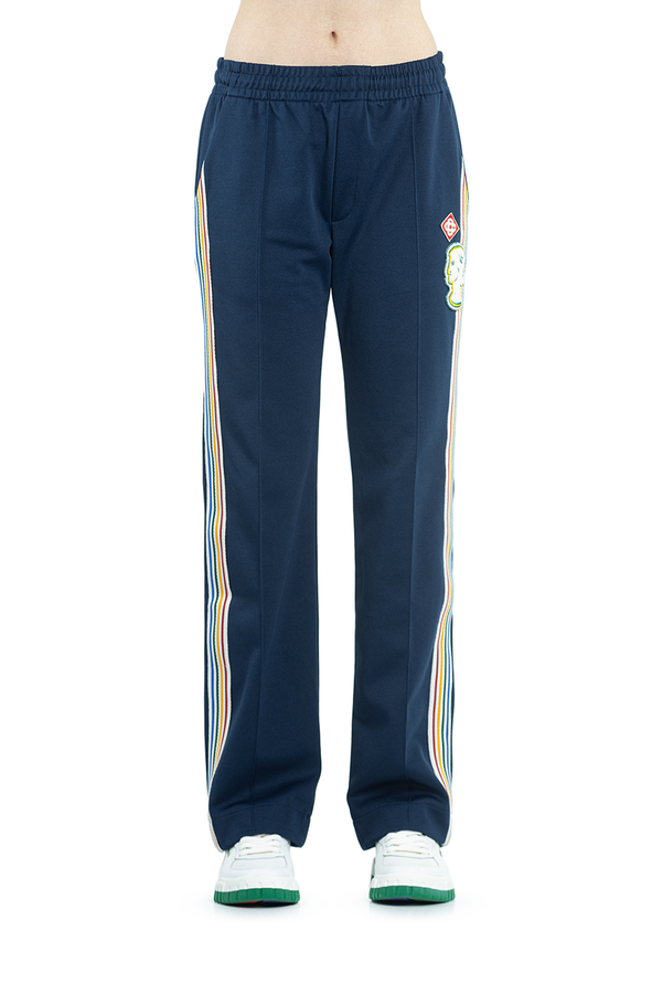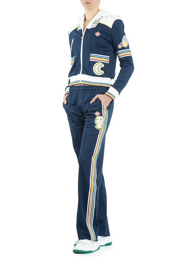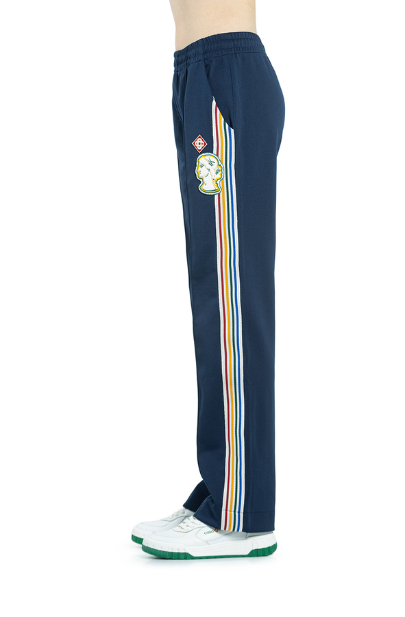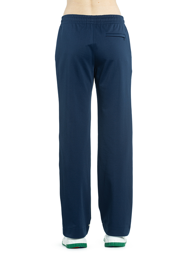 - Брюки с эластичным поясом, полосная детализация, нашивка логотипа спереди, два прорезных кармана по бокам и один на молнии сзади