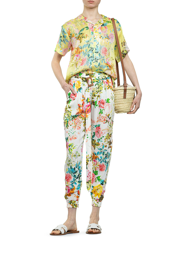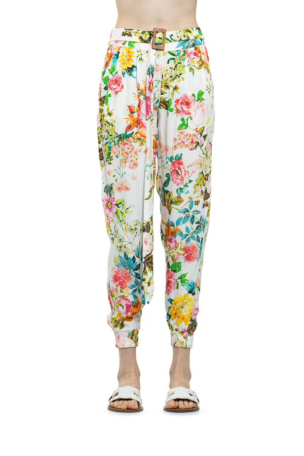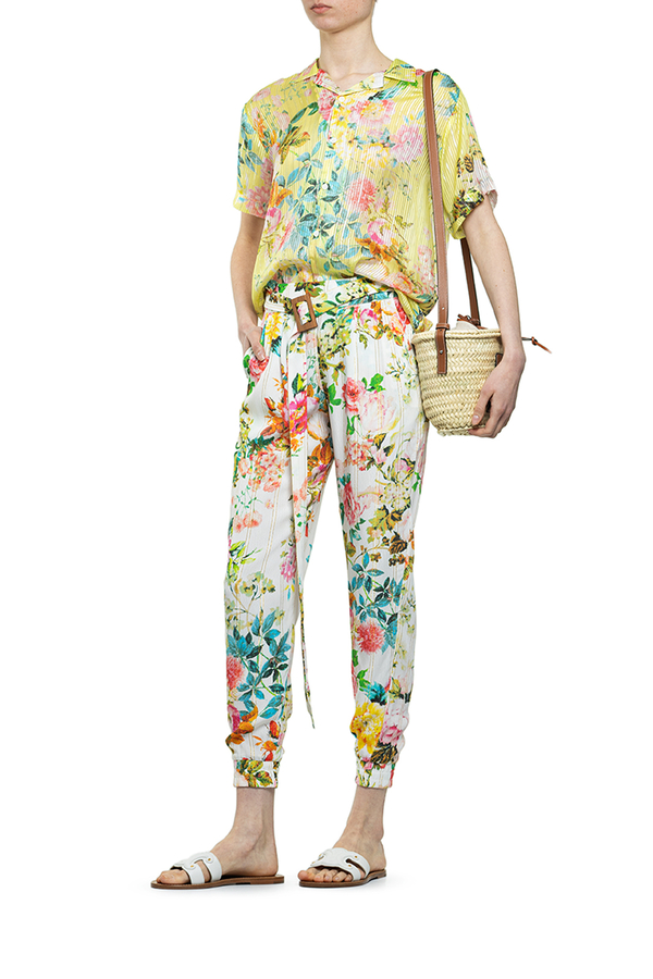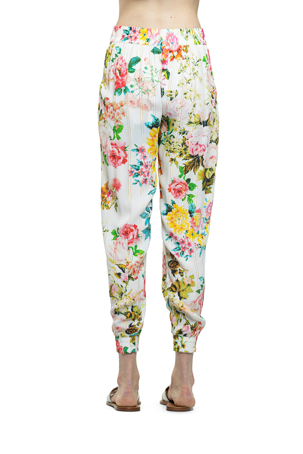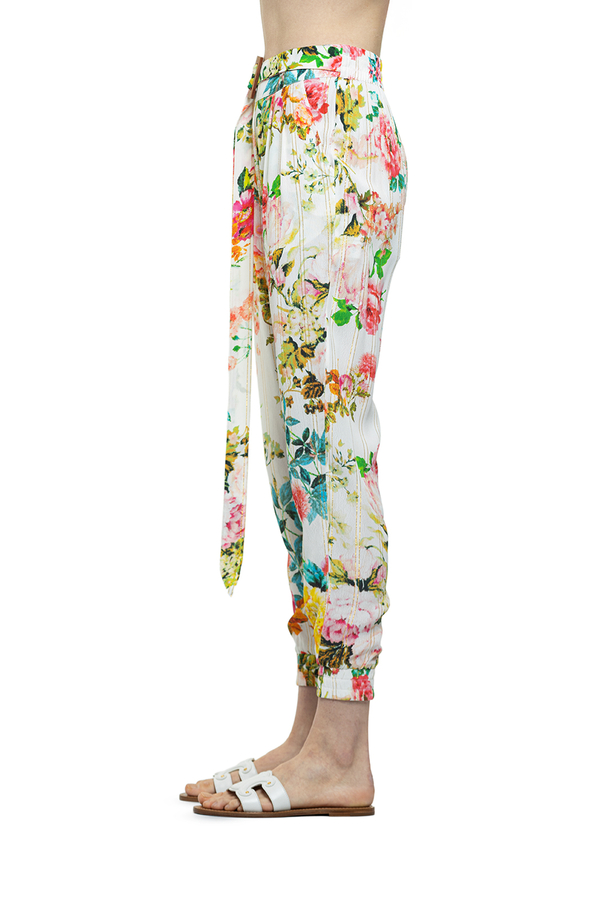 - Штани білі у різнокольорових великих квітах на манжетах, з поясом