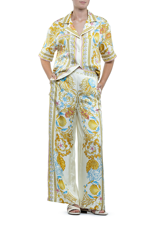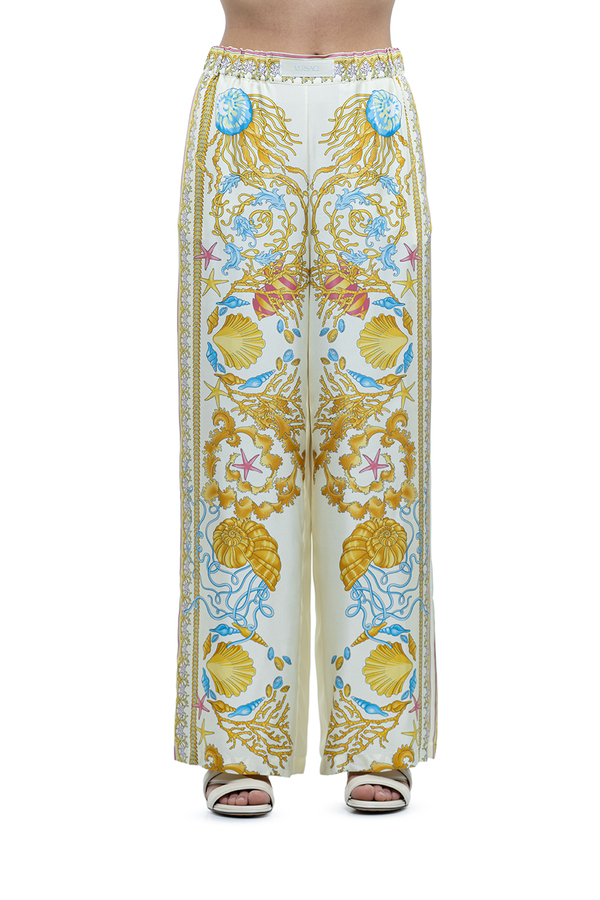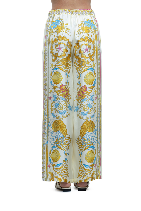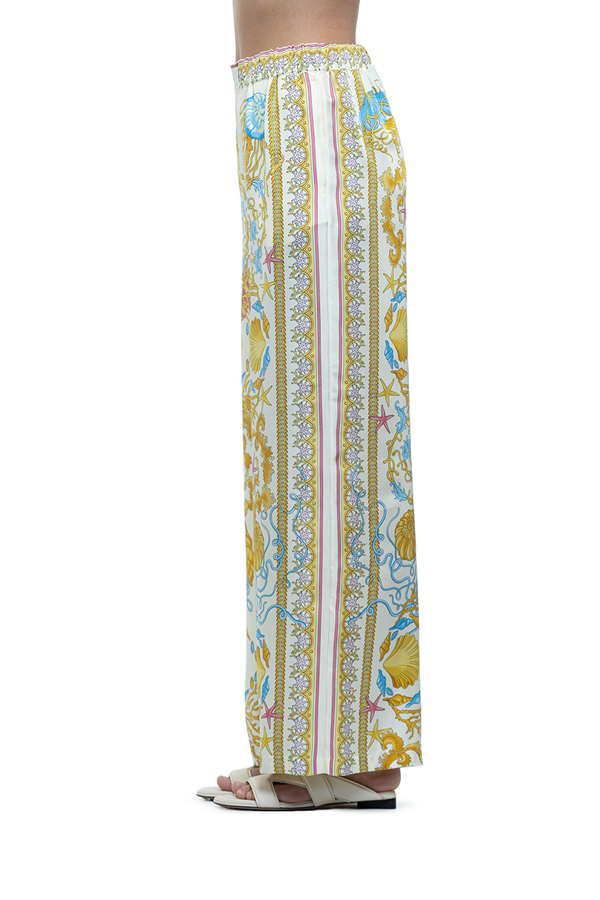 - Широкие брюки в пижамном стиле, принт барокко, два боковых прорезных кармана, эластичный пояс, этикетка с логотипом на поясе.
