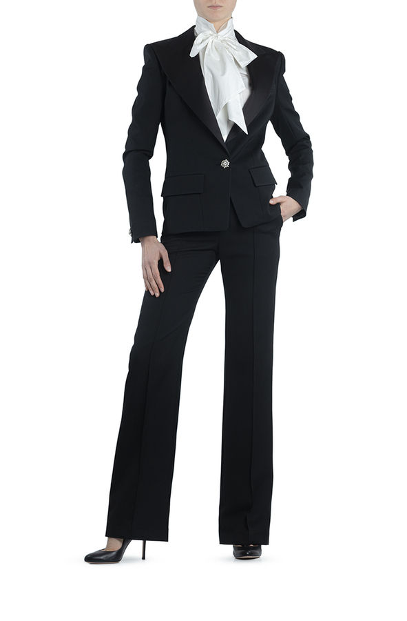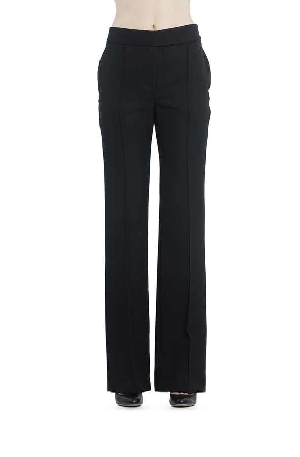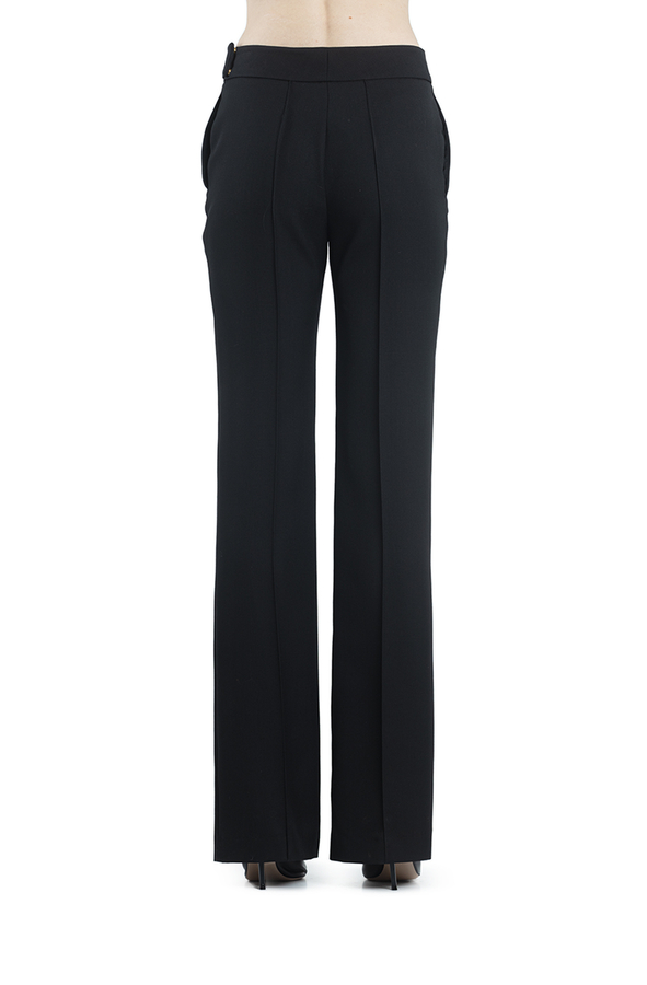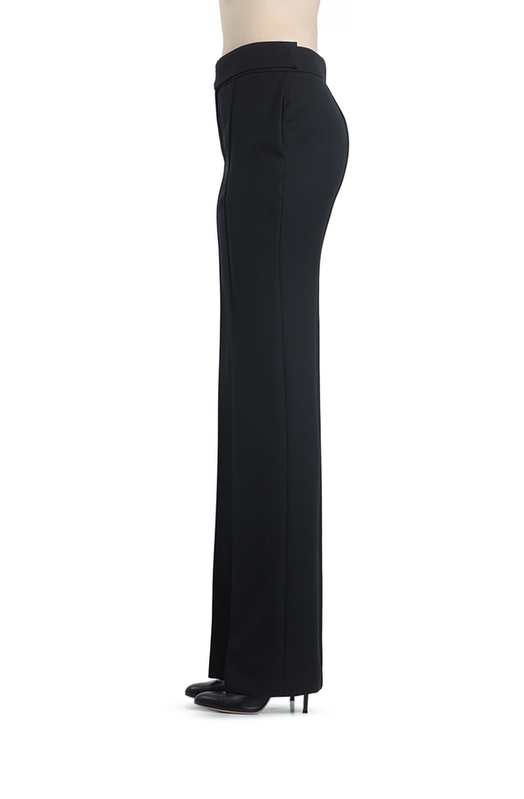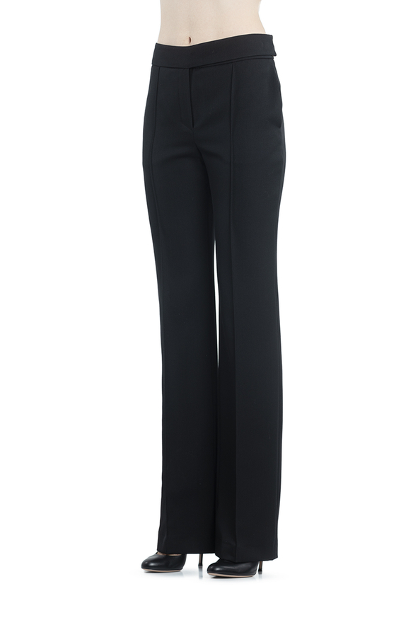 - Брюки свободного крою. Стрілки на брючинах, завищена талія, защіпи, потайна застібка спереду і дві прорізні кишені з боків.