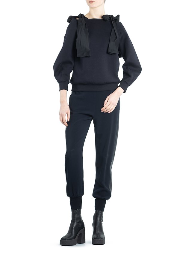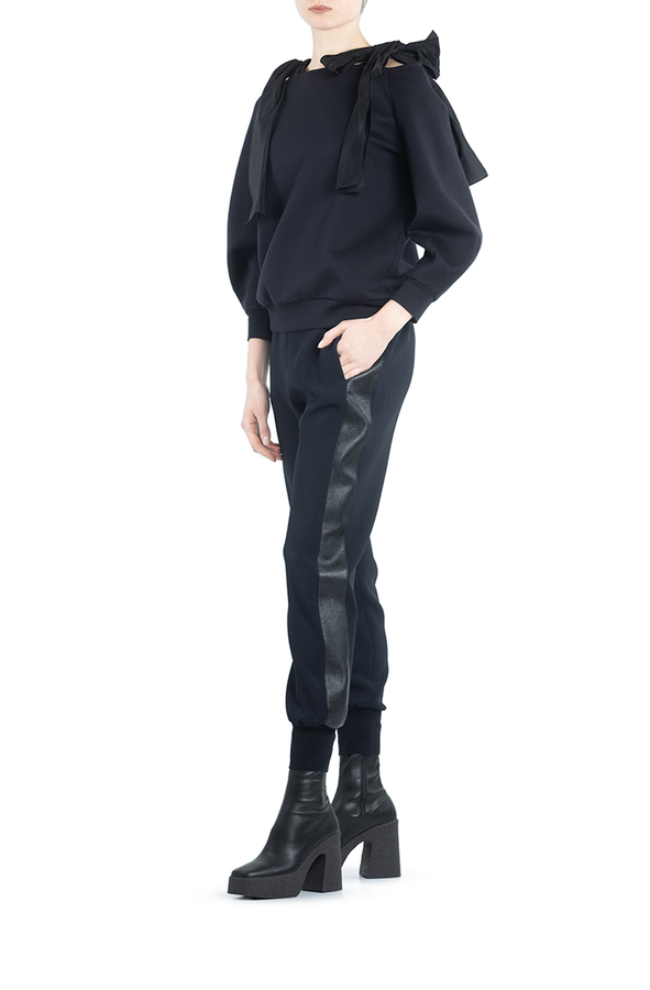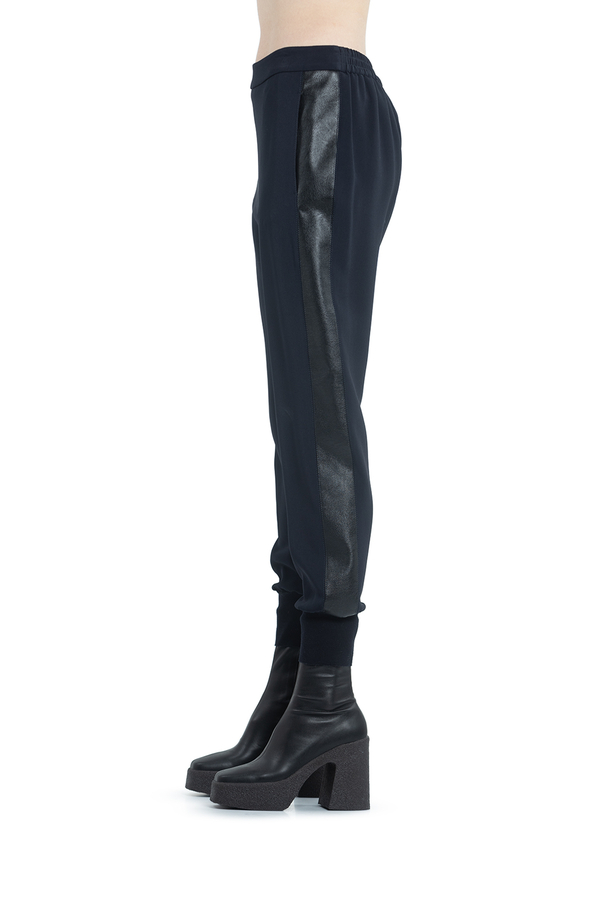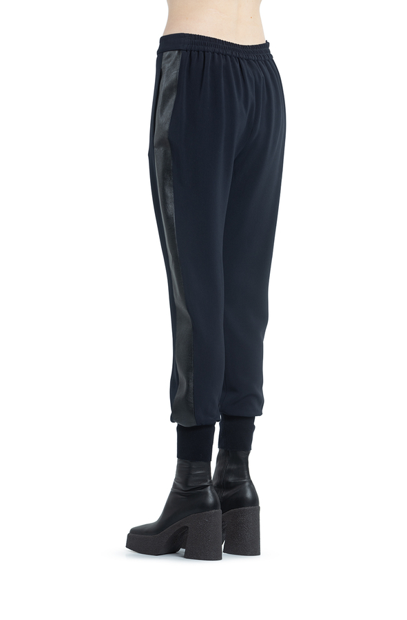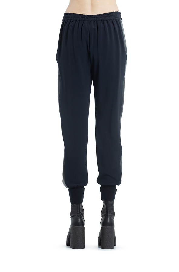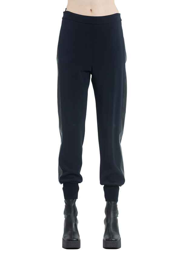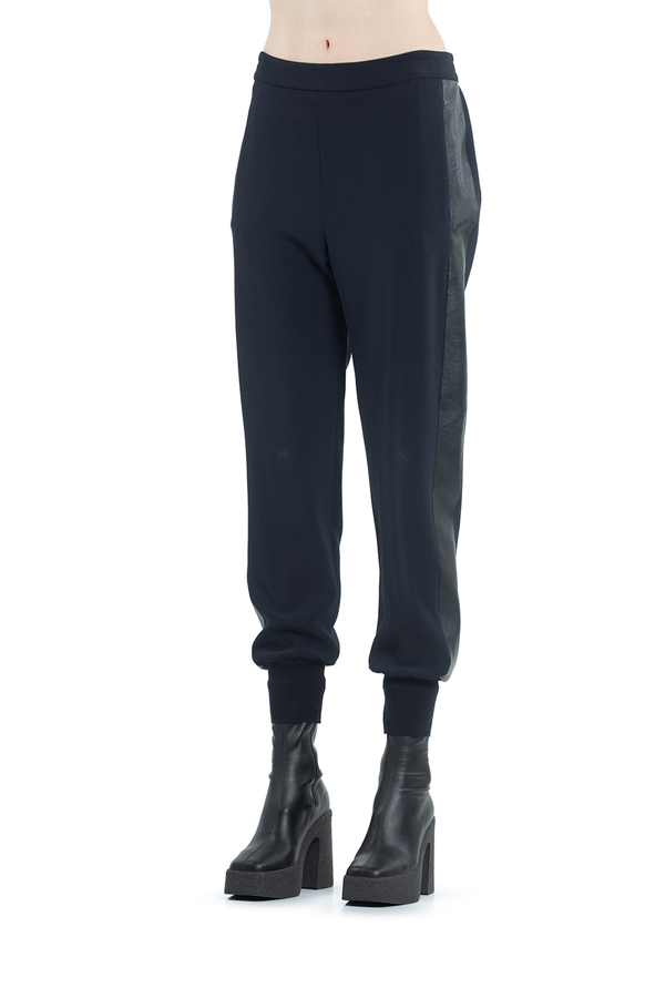 - Штани з еластичного крепу прямого крою, з лампасами з боків. високою посадкою.