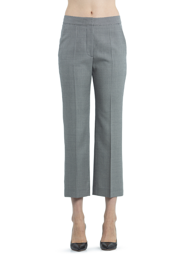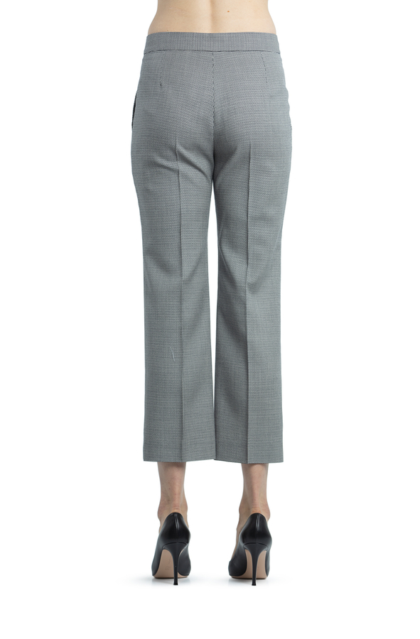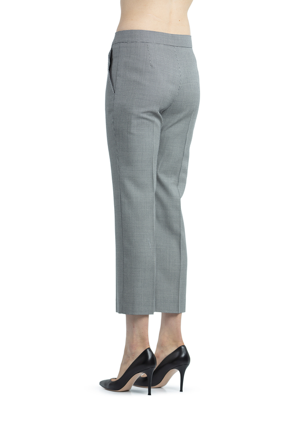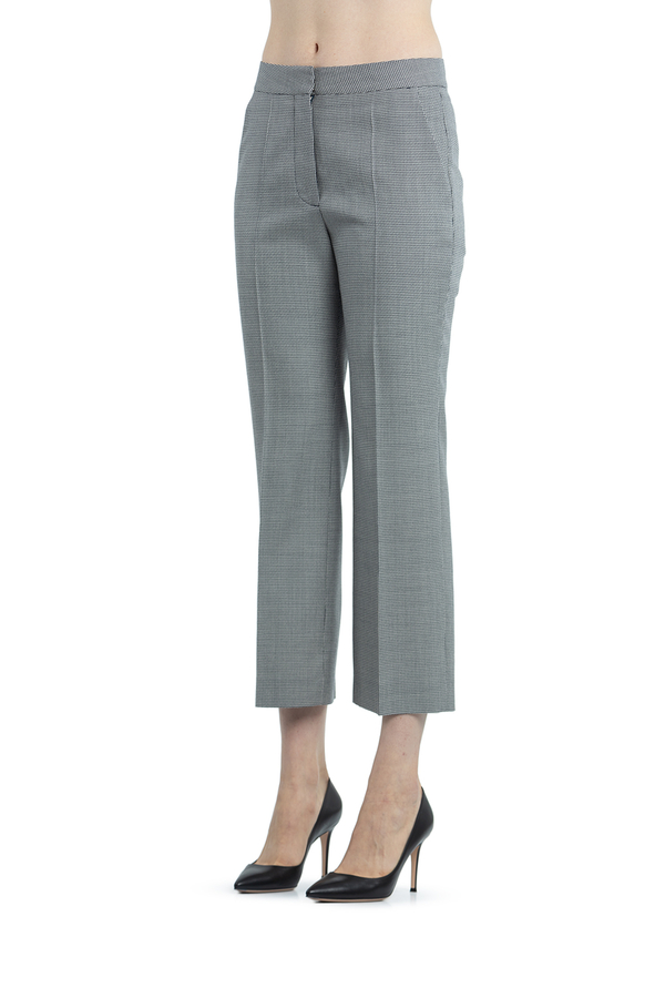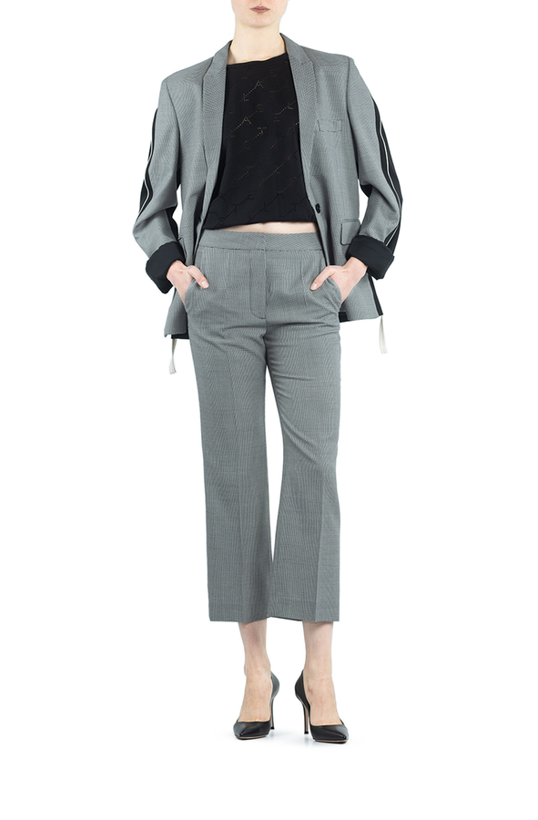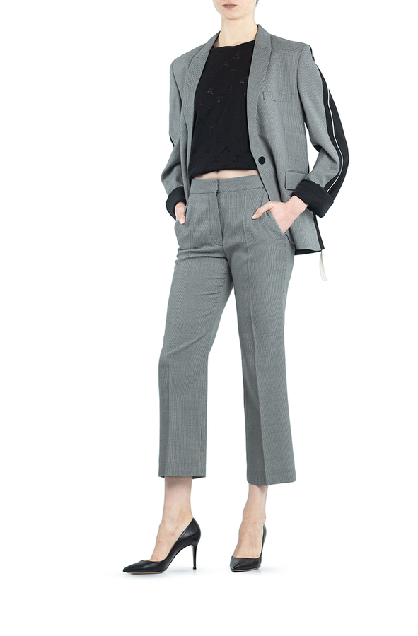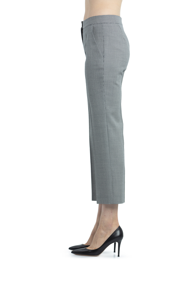 - Штани прямого крою з принтом у ламану клітинку. Висока талія, на широкому поясі, застібка на блискавку і гачки. Дві бічні прорізні кишені і укорочена довжина.